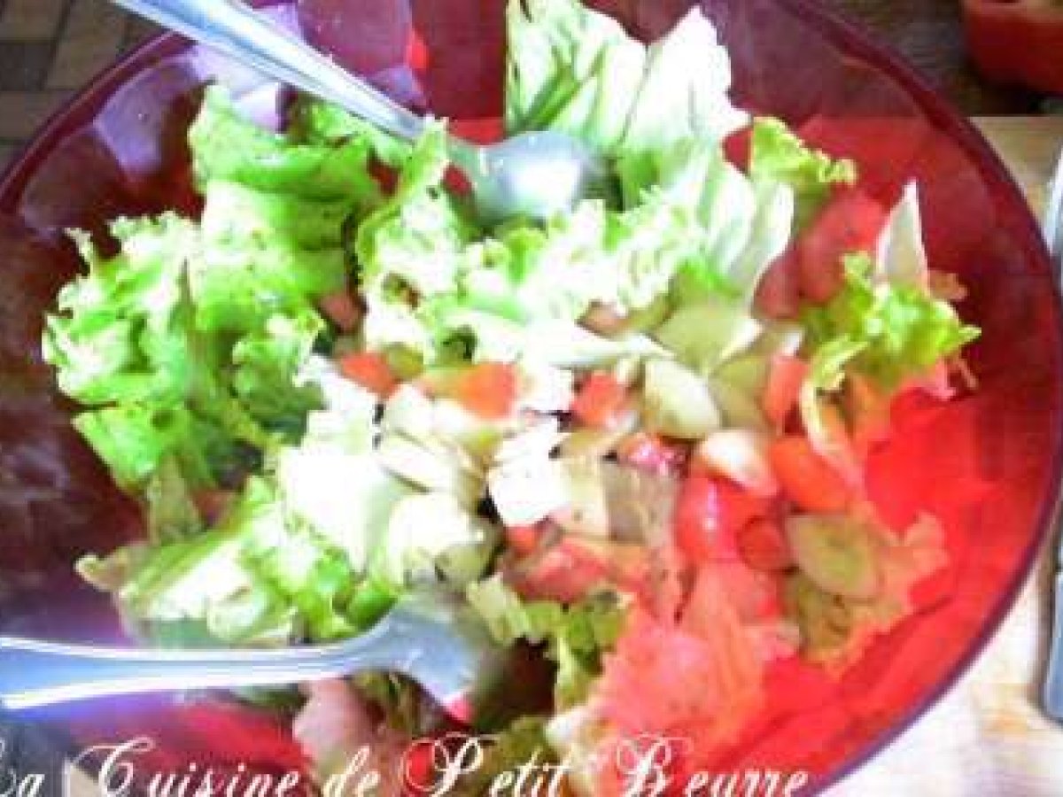 Salade grecque à ma façon Entréefacile10 min130 Kcal Envoyer cette recette à un ami Imprimer cette page Poser une question à l'auteur Publier votre photo de cette recette Ingrédients 4 pour une salade bien fraîche l'été, je prépare une salade avec : 1 laitue ou batavia 125g de féta ou de bours*n salade 1 poivron vert 1 poivron rouge 3 tomates 1 concombre des olives dénoyautées Coût estimé: 5.22Euros€ (1.3€/part)