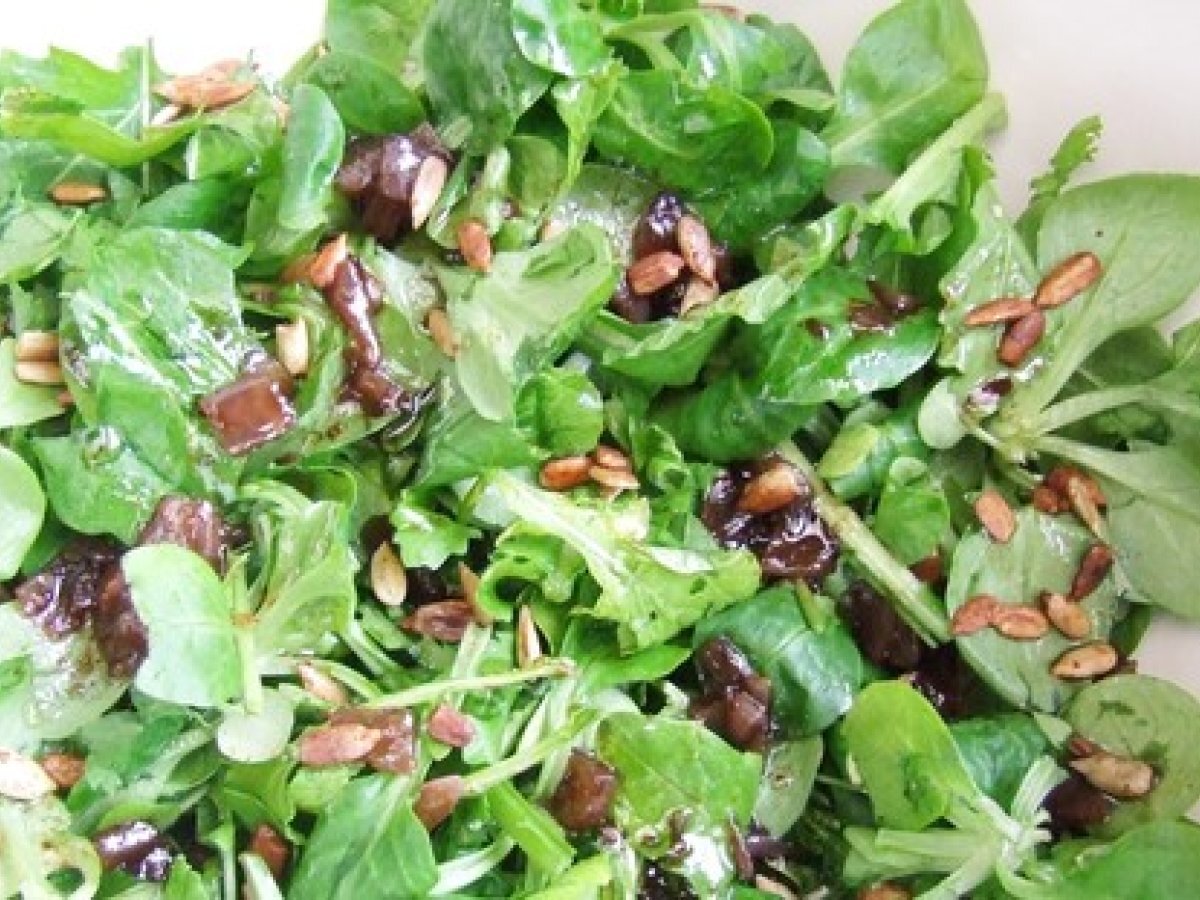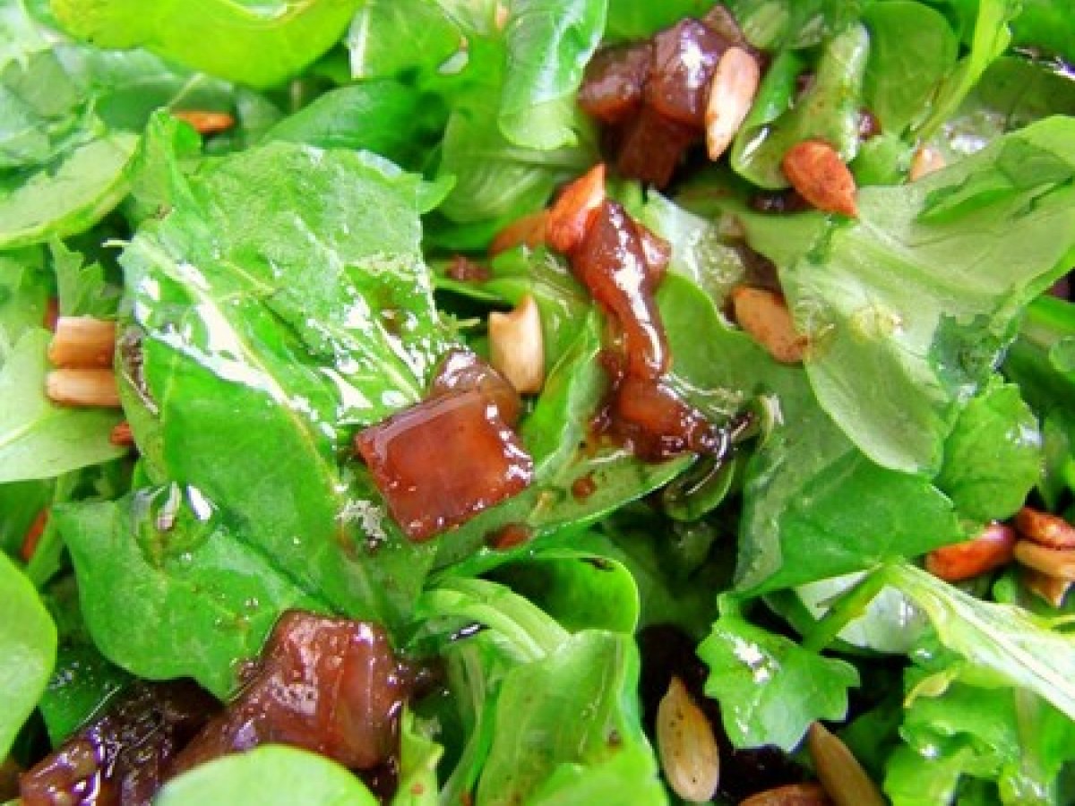 Salade hivernale: mâche, roquette, coriandre & graines de tournesol caramélisées,...