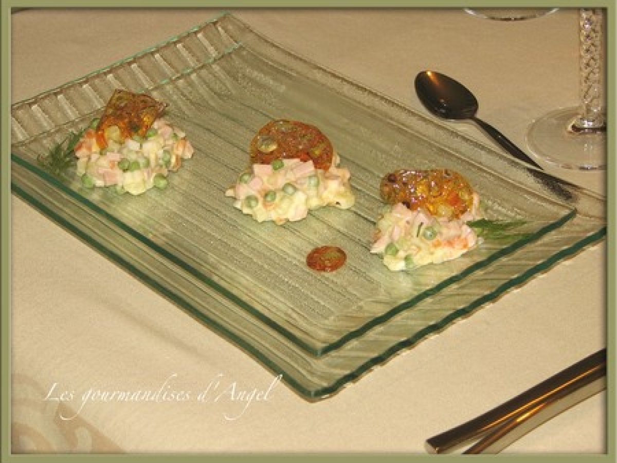 Salade "olivier" votez maintenant PrécédentSuivant Entréefacile30 min1057 Kcal Envoyer cette recette à un ami Imprimer cette page Poser une question à l'auteur Publier votre photo de cette recette C'EST DIVIN!! Ingrédients 2 4-5 pommes de terre 3 carotte 1 gros oignon 4 oeufs 200 grammes de petits pois (conserve ou frais et cuit dans l'eau salé) 200 - 300 grammes de cervelas (jambon blanc) 1 concombre (ou cornichons mariné a la russe) mayonnaise aneth sel poivre Coût estimé: 5.46Euros€ (2.73€/part)