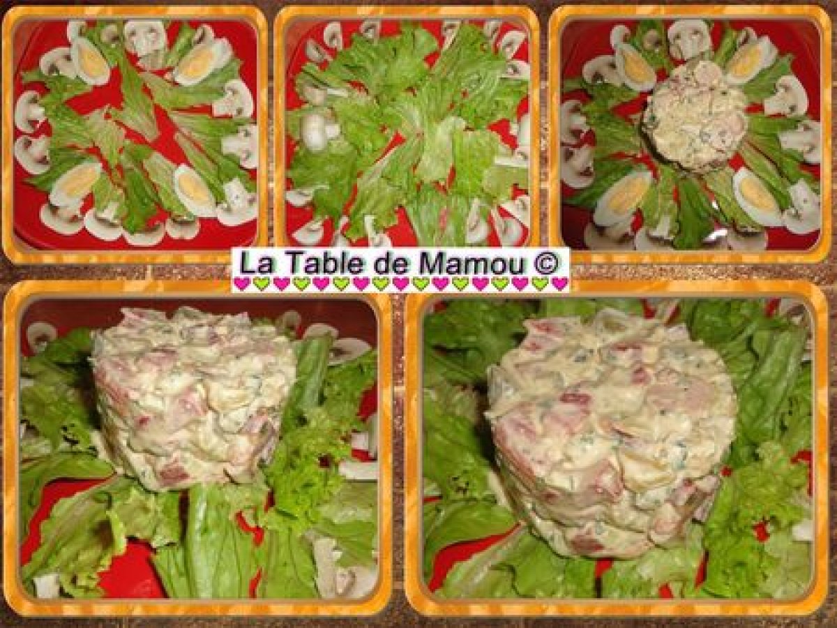 Salade piémontaise votez maintenant PrécédentSuivant Entréemoyen24 min Envoyer cette recette à un ami Imprimer cette page Poser une question à l'auteur Publier votre photo de cette recette Ingrédients 8 5 pommes de terre, 2 oeufs durs, 1 grosse tomate, 10 cornichons, 2 knacks, 2 échalotes, 2 belles branches de persil plat, ciboulette, basilic, 1 cuillère à soupe de mayonnaise, 1 cuillère à soupe de moutarde mi-forte, 1 petit suisse nature (60 g), 1 cuillère à café d'estragon (surgelé), 2 cuillères à soupe de Melfor Maggi à volonté, 6 champignons de paris, feuilles de batavia.