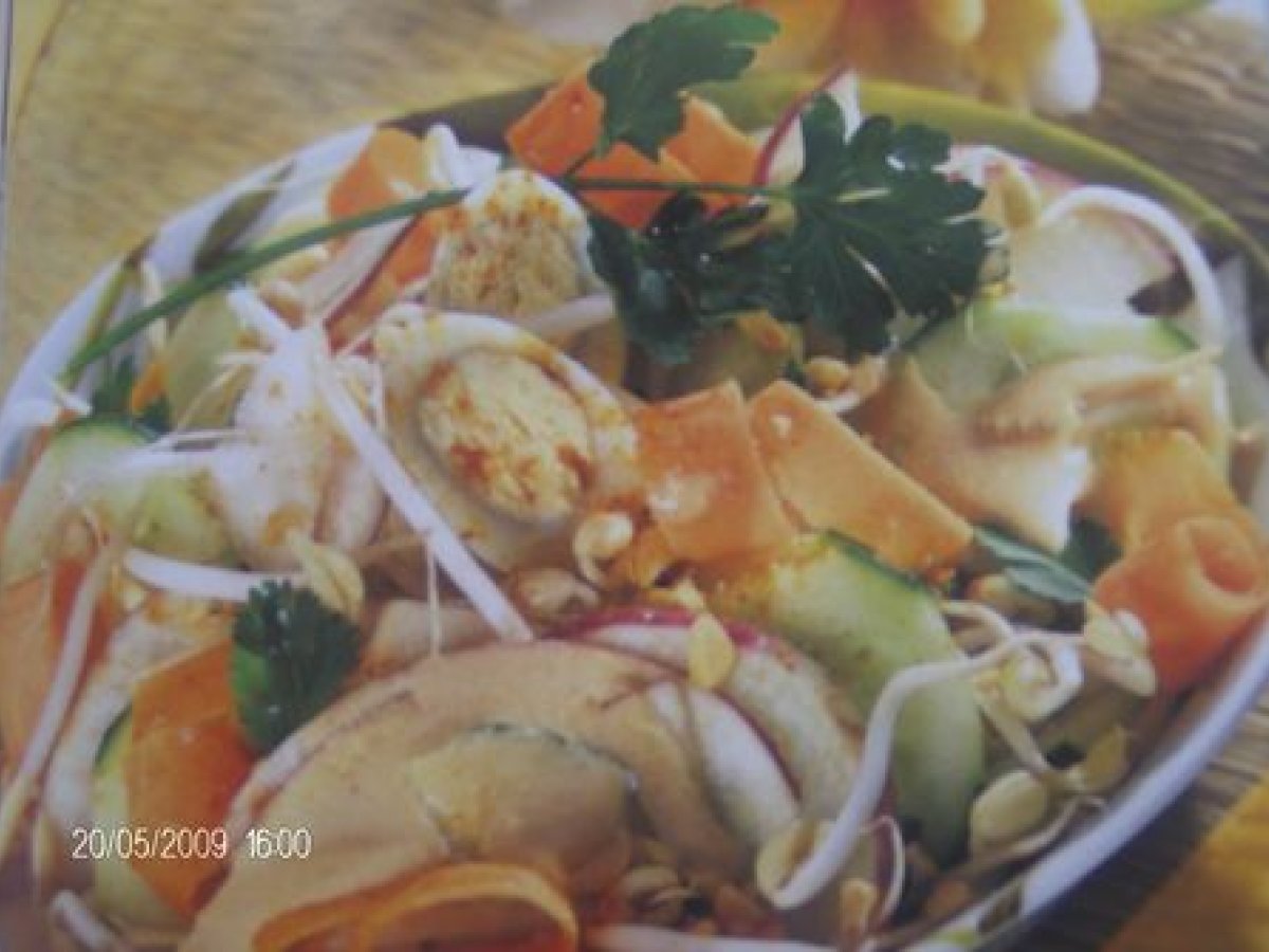 Salade rafraichissante à l'indonésienne votez maintenant Entréefacile20 min324 Kcal Envoyer cette recette à un ami Imprimer cette page Poser une question à l'auteur Publier votre photo de cette recette Ingrédients 2 4 oeufs de caille 2 carottes 2 jeunes navets 1 concombre 200 g de germes de soja 1/4 de botte de persil plat 3 tiges de coriandre 1 gousse d'ail 1 jus de citron 1 cuillère à soupe de de sauce de soja 1 cuillère à café de piment en poudre 100 ml de lait de coco 20 g de cacahuètes sel