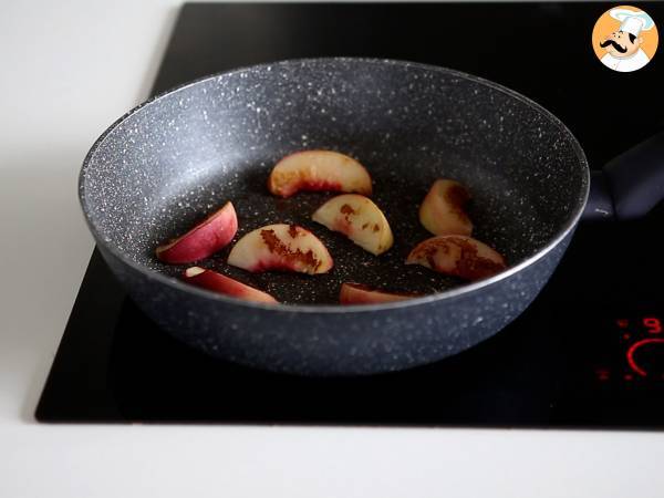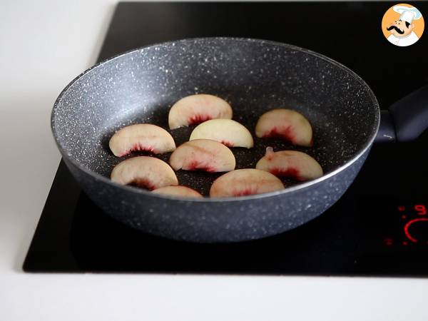 Puis faire rôtir les morceaux de pêches : disposer les tranches dans une poêle chaude et les retourner lorsqu'elles sont dorées. Retirer du feu quand les deux faces sont dorées.