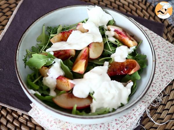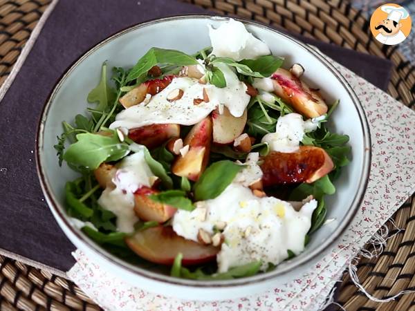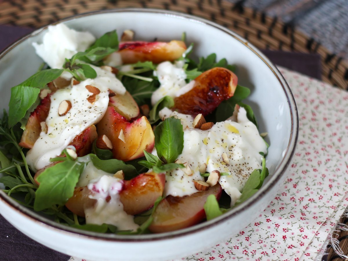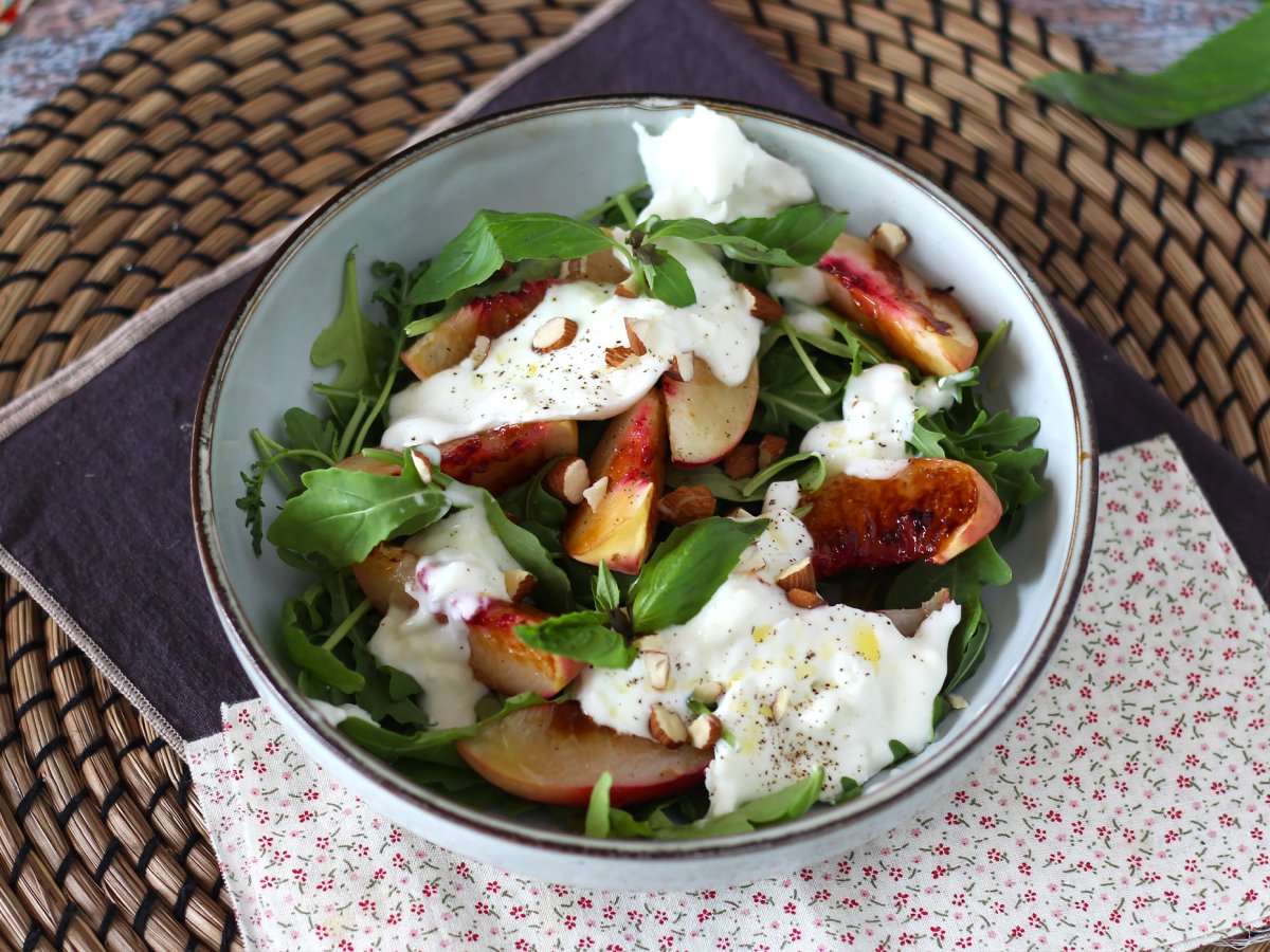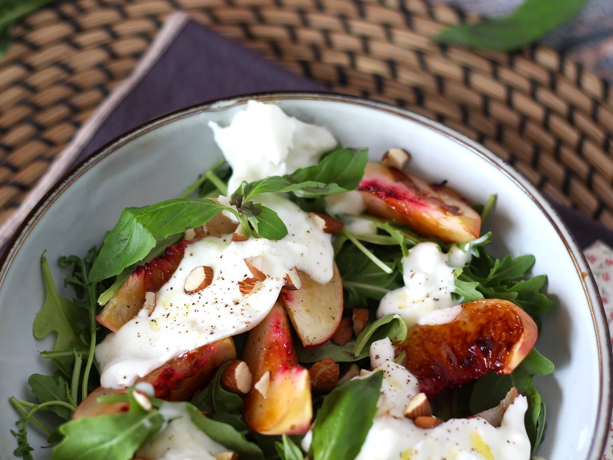 Salade sucrée salée aux pêches rôties, roquette et burrata (les douces saveurs d'été)