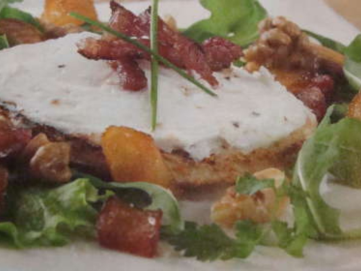 Salade tiède aux lardons, aux pommes et au chèvre Entréemoyen40 min Envoyer cette recette à un ami Imprimer cette page Poser une question à l'auteur Publier votre photo de cette recette Ingrédients 1 Ingrédients (4 personnes). 250 g de lardons fumés (espace fraîcheur). 3 pommes (Jonagold par ex.). 175 g de salade mixte (mesclun par ex.). 300 g de fromage de chèvre frais. 1C.à SOUPE DE BEURRE. 4 TRANCHES DE PAIN TOAST. 3C.à SOUPE DE SIROP DE LIÈGE. 2C à SOUPE DE MÉLANGE DE NOIX. 1à2C à SOUPE DE VINAIGRE DE VIN ROUGE.