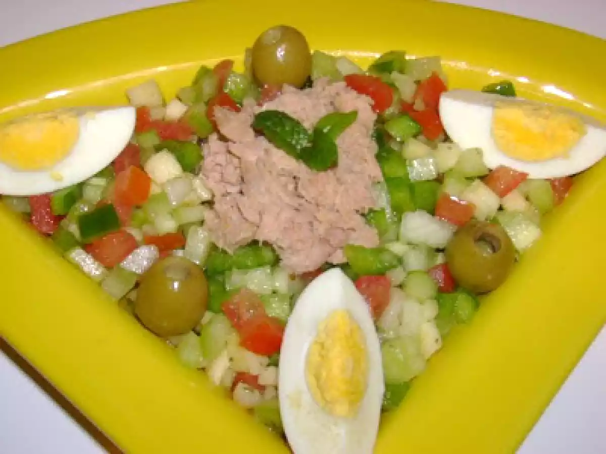 Salade tunisienne Entréefacile20 min Envoyer cette recette à un ami Imprimer cette page Poser une question à l'auteur Publier votre photo de cette recette Ingrédients 2 1 petit concombre 2 petites tomates 1 poivron vert 1 petit oignon 1 pomme 1/2jus d' citron thon à l'huile un peu d'huile d'olive 1 oeuf dur olives sel poivre 1 pincée de menthe séchée