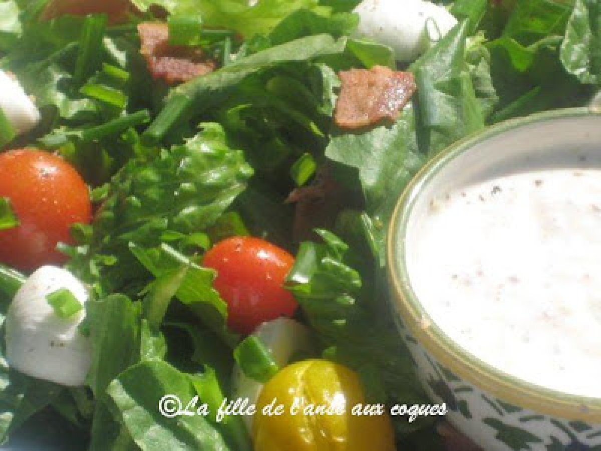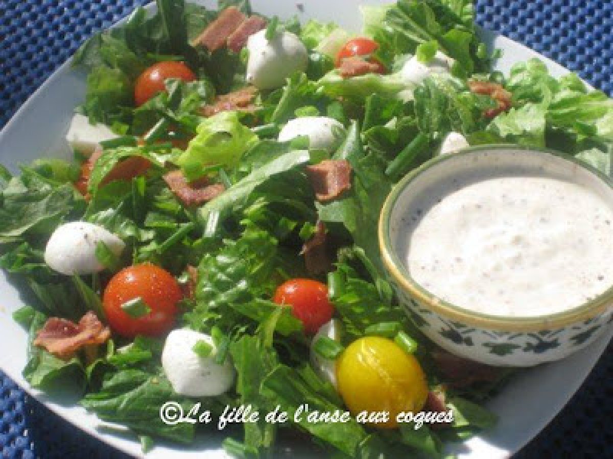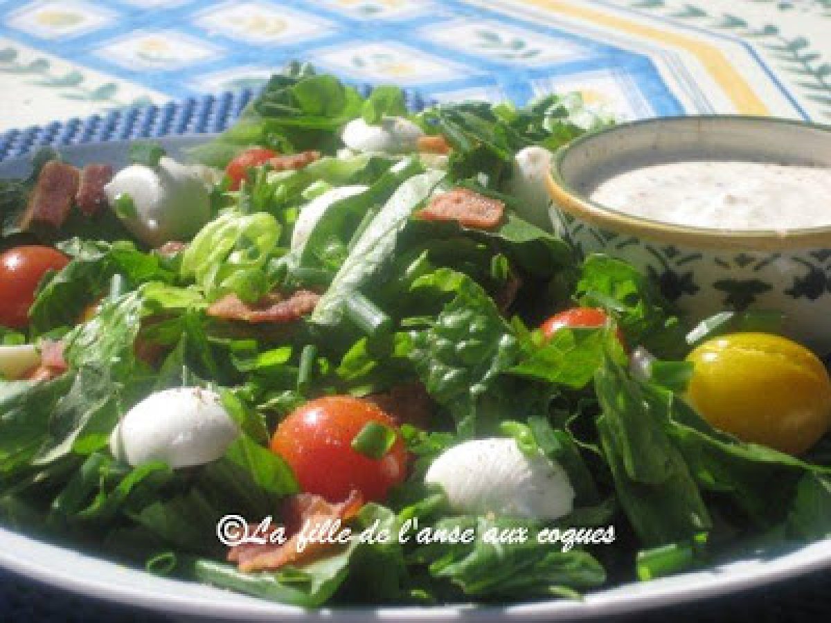 Salade verte au bacon et à la tomate votez maintenant PrécédentSuivant Entréefacile10 min385 Kcal Envoyer cette recette à un ami Imprimer cette page Poser une question à l'auteur Publier votre photo de cette recette Ingrédients 4 250 g (environ 1 ½ tasse) de tomates cerises Huile d'olive 6 tranches de bacon 180 g (environ 1 tasse) de bocconcini coupés en deux 1 grosse laitue romaine Mayonnaise à la moutarde : 100 g (environ 1/3 tasse) de mayonnaise (fait un mélange de yogourt nature de de mayonnaise) 2 cuillères à thé (10 ml) de moutarde à l'ancienne 60 ml (¼ tasse) de jus de citron ciboulette fraîche au goût sel et poivre pour la mayonnaise à la moutarde et la salade Coût estimé: 8.56Euros€ (2.14€/part)