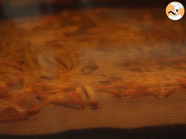 Essorer les frites et mélanger avec 1 c. à soupe d'huile d'olive. Mettre sur une plaque de cuisson avec du papier sulfurisé pendant 20 minutes au four à 220°C. Laisser refroidir.
