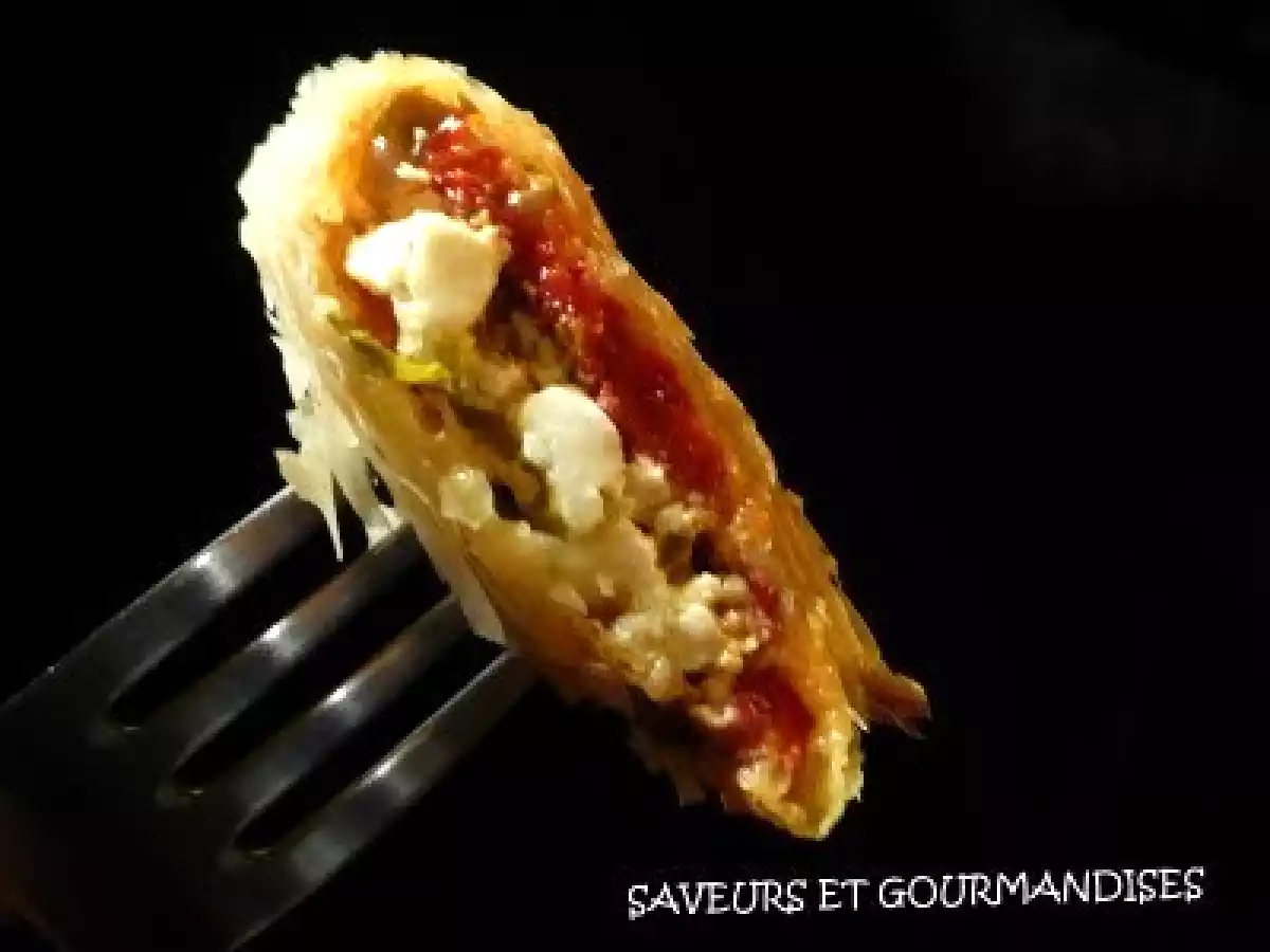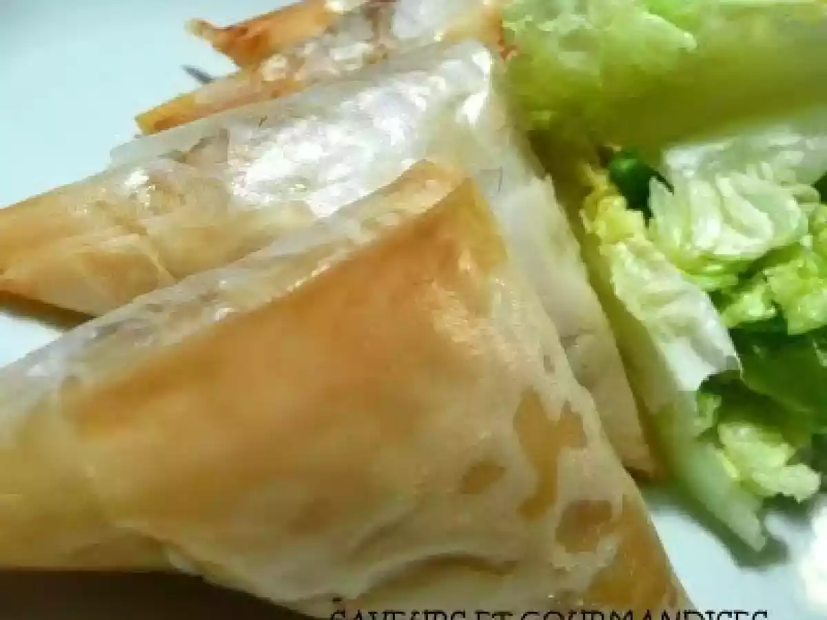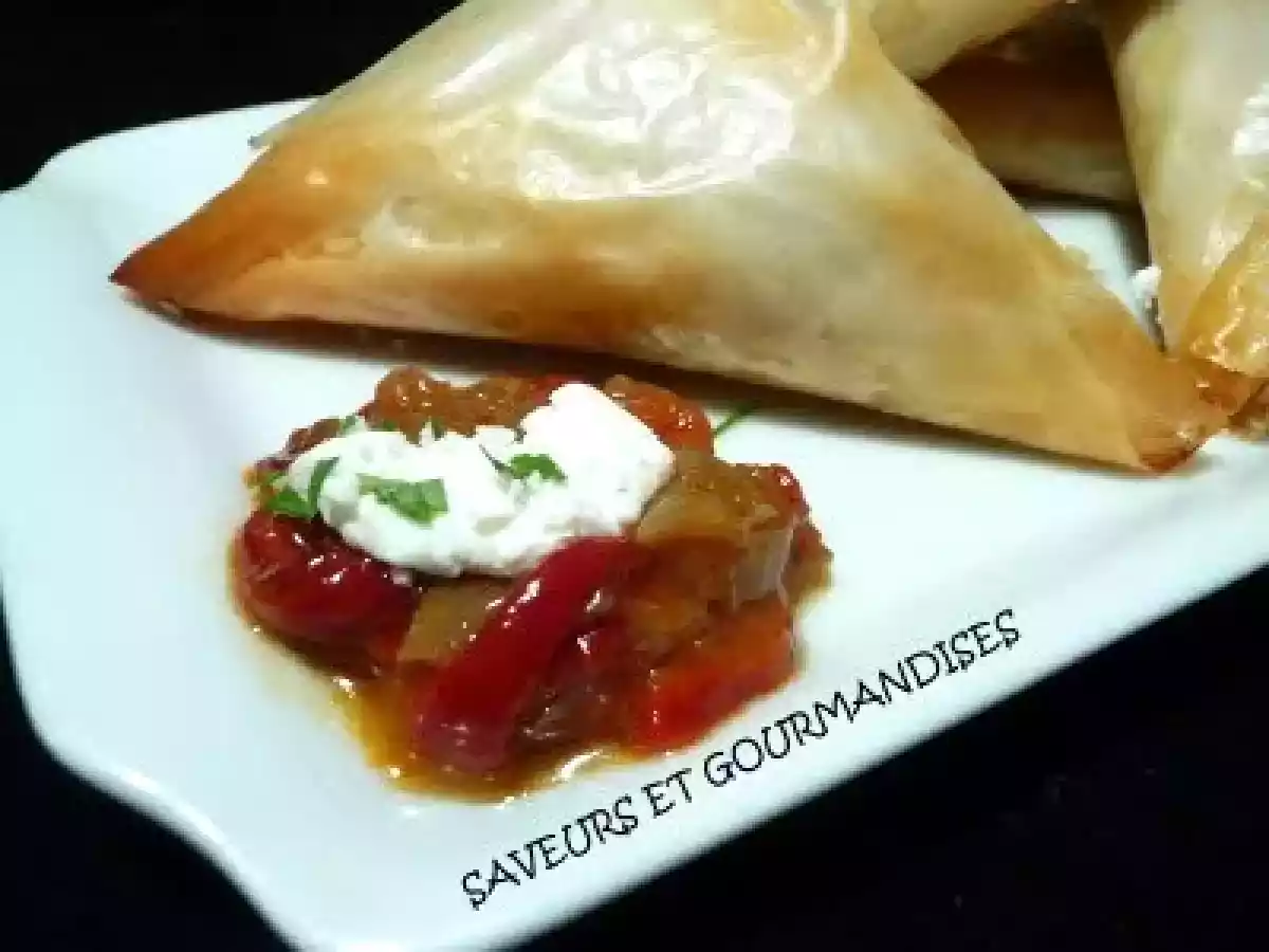 Samossas à la fondue de poivrons et feta. PrécédentSuivant Entréemoyen1 h 15 m Envoyer cette recette à un ami Imprimer cette page Poser une question à l'auteur Publier votre photo de cette recette Ingrédients 5 4 poivrons rouges 2 gousses d'ail 200 gr de feta Du poivre Du persil ciselé 1 gros oignon rouge 1/2 cube de légumes 1 cuillère à café d'ibhar ou + selon goût ( épices du Moyen-Orient ou curry ou ras el hanout) Une pincée de piment rouge 2 cuillères à soupe d'huile d'olive De l'huile neutre 10 feuilles de pâte à filo ( feuilles de brick).