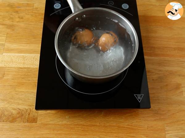 Faire bouillir de l'eau dans une casserole, déposer les œufs dedans et faire cuire 5 minutes. Sortir de l'eau et transférer dans un bol d'eau très froide pour stopper la cuisson.