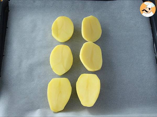 Peler et couper les pommes de terre en deux. Les disposer sur une plaque de cuisson, et arroser d'un filet d'huile d'olive. Saler, poivrer.