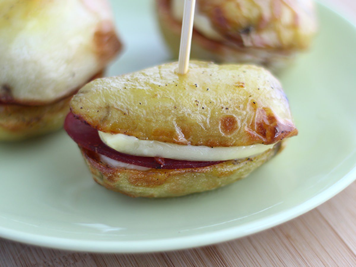 Sortir du four, et disposer une demie tranche de jambon cru sur la moitié des pommes de terre. Mettre une moitié de pomme de terre par-dessus, et utiliser une pique a brochette ou de la ficelle pour tenir la pomme de terre.