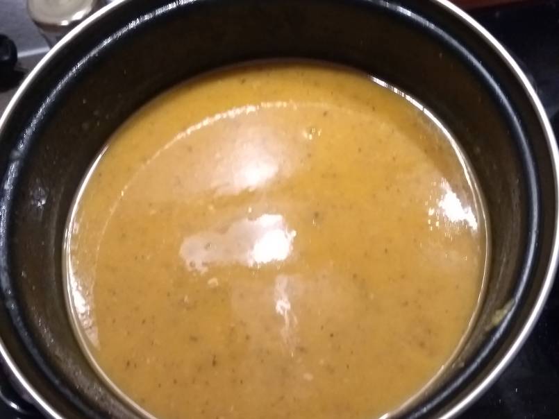 Peler et couper le butternut en gros cubes. Dans une marmite, mettre les morceaux de butternut, les lentilles, les épices, le lait de coco et l'eau.