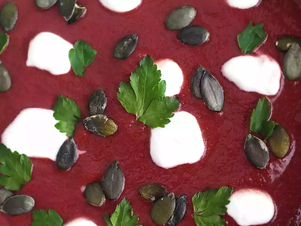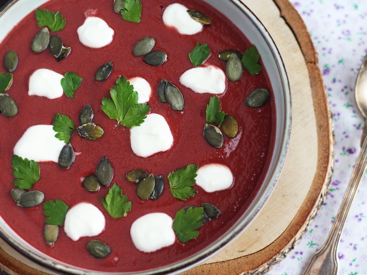 Mettez de la couleur dans votre repas avec cette soupe de betterave ! Très facile à faire, vous pourrez la disposer dans des bols, assiettes creuses ou encore verrines pour l'apéritif. Agrémentée de yaourt, graines de courge et persil, vous voici avec une nouvelle manière de cuisiner la betterave :-)