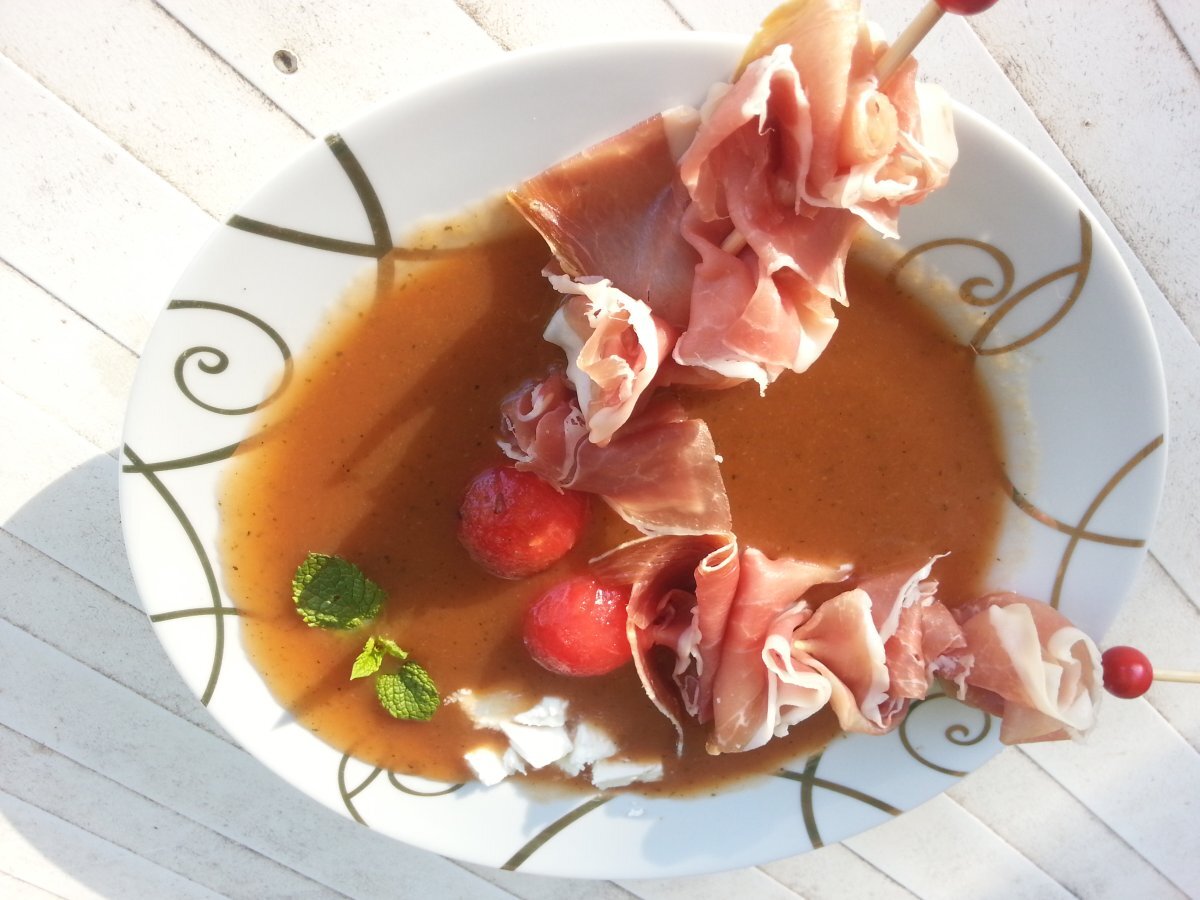 Soupe froide pastèque-melon, menthe, féta et jambon cru