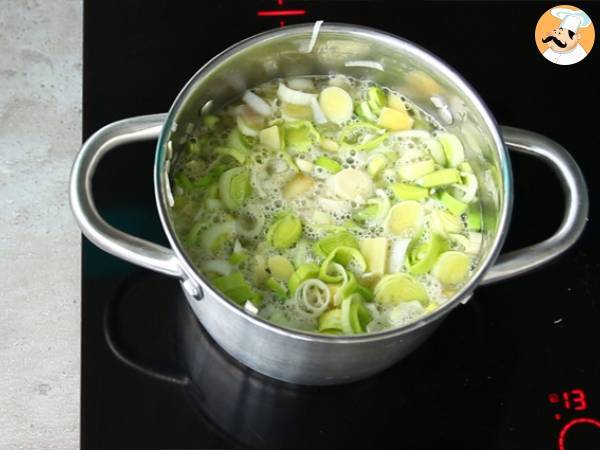 Ajoutez ensuite les pommes de terre coupées en dés, et faites les revenir quelques minutes. Puis ajoutez les poireaux émincés. Mélangez bien.