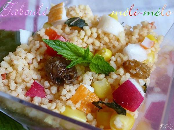 Une entrée colorée très rafraichissante. Partie d'un taboulé normal, des invités surprise qui arrivent et des ingrédients surprise qui viennent s'ajouter : tout le monde a trouvé ça extra !