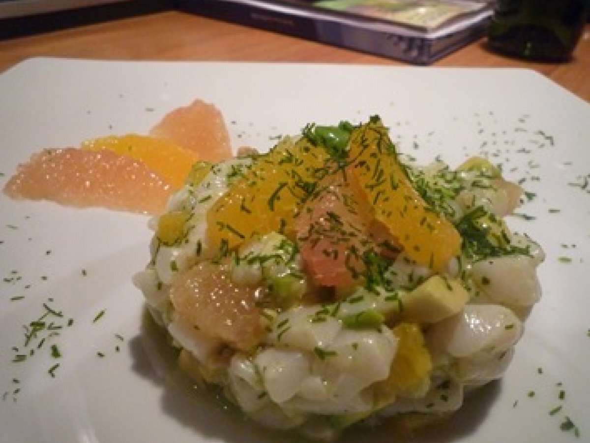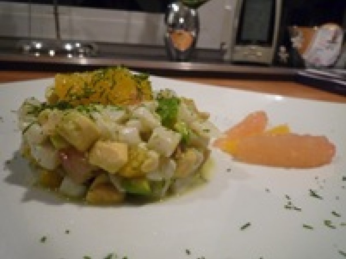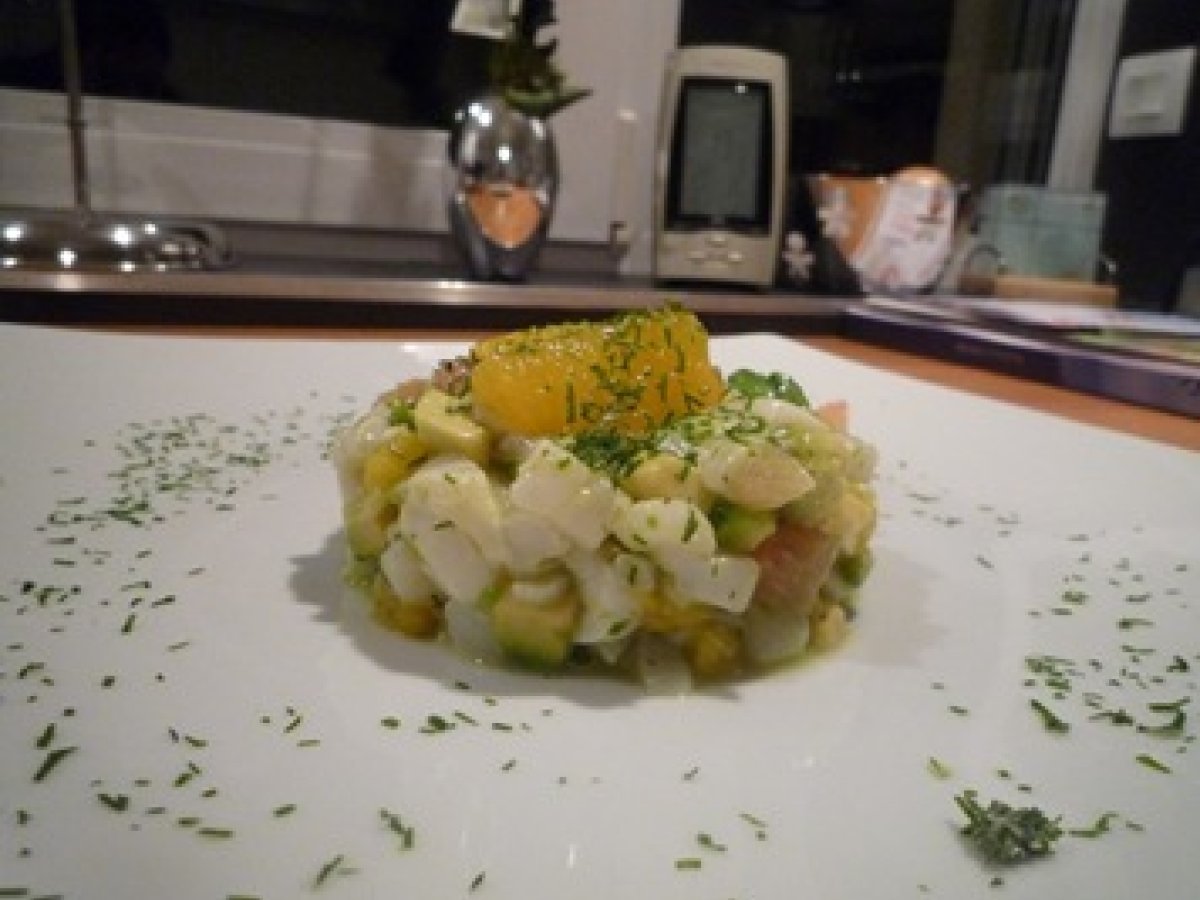Tartare de noix de saint-jacques aux agrumes PrécédentSuivant Entréefacile10 min297 Kcal Envoyer cette recette à un ami Imprimer cette page Poser une question à l'auteur Publier votre photo de cette recette Ingrédients 4 12 grosses noix de Saint-Jacques sans corail 2 citrons verts 1 orange 1/2 pamplemousse 1 avocat 4 tranches de saumon fumé 15 g de gingembre frais 2 cuillères à soupe d'huile d'olive 4 brin d'aneth Sel de guérande Poivre