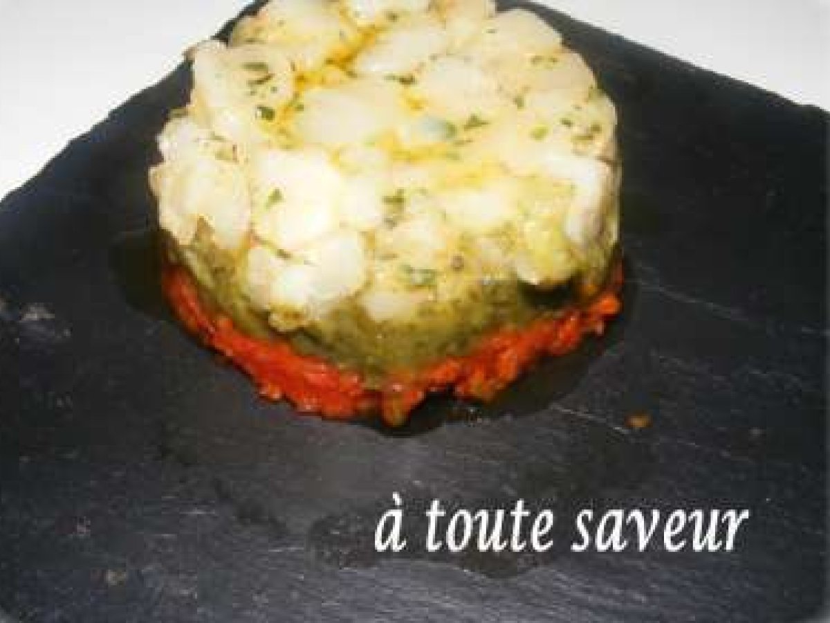 Tartare de saint jacques crème de basilic et confit de tomates