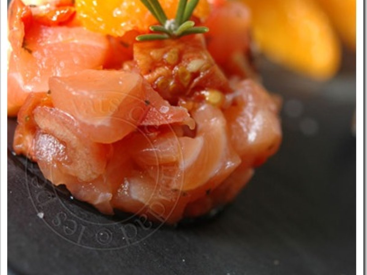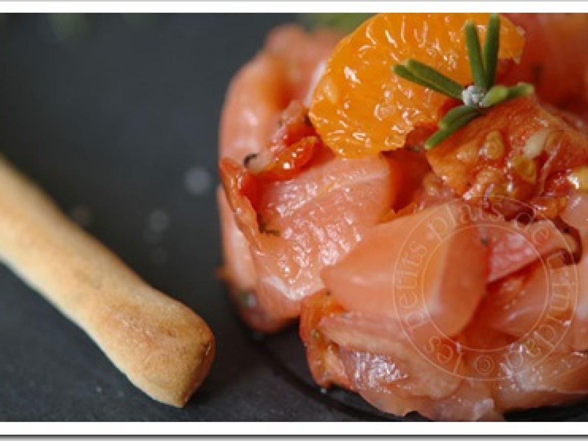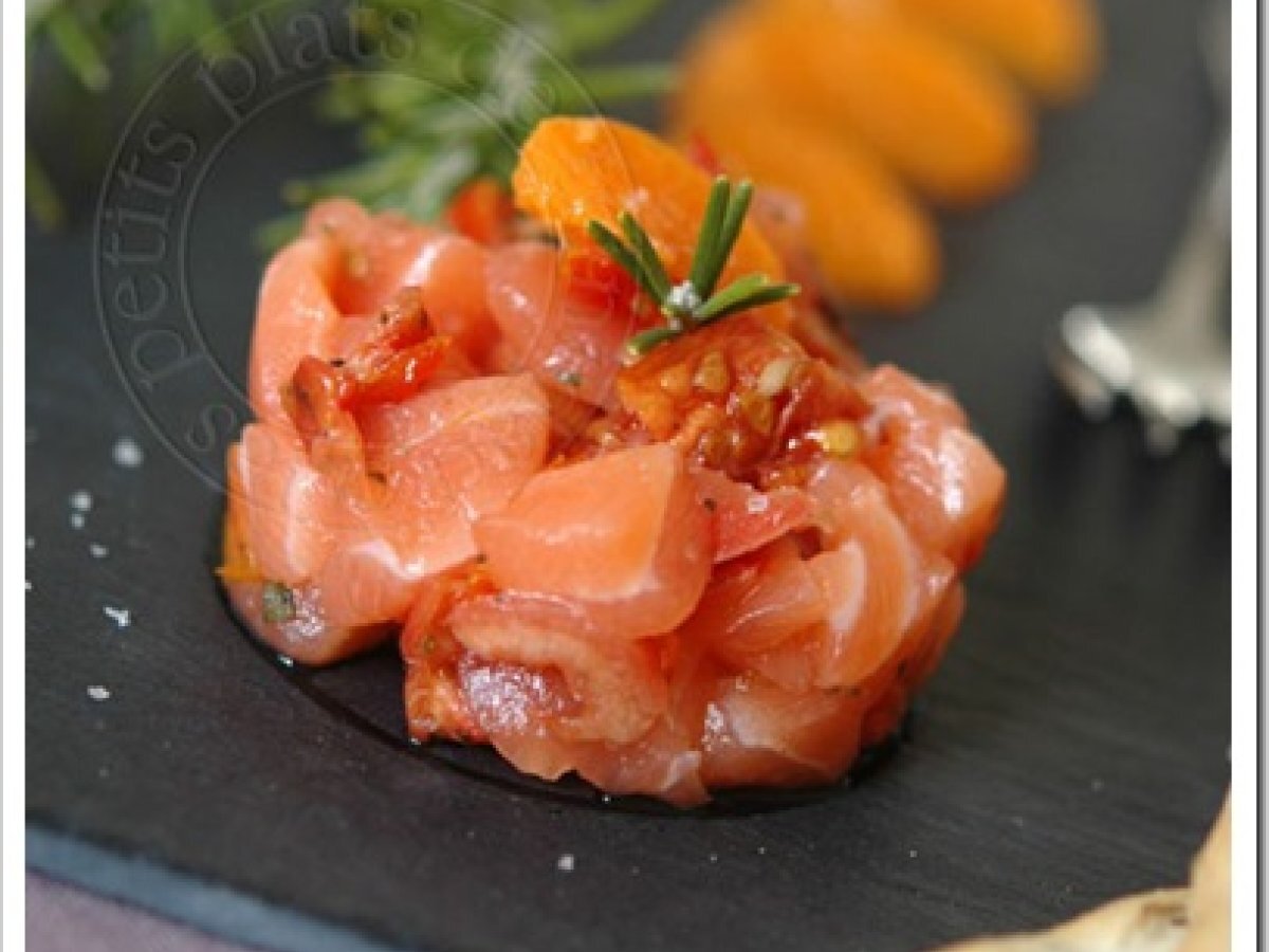 Tartare de saumon, tomates confites et clémentines PrécédentSuivant Entréefacile8 min125 Kcal Envoyer cette recette à un ami Imprimer cette page Poser une question à l'auteur Publier votre photo de cette recette Ingrédients 6 2 pavés de saumon frais 3 clémentines 1 brin de romarin 12 quartiers de tomates confites aux herbes et à l?ail sel poivre huile d'olive (2 cuillères à soupe) Coût estimé: 6.28Euros€ (1.05€/part)
