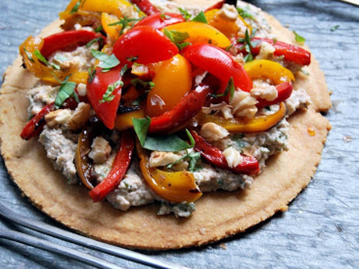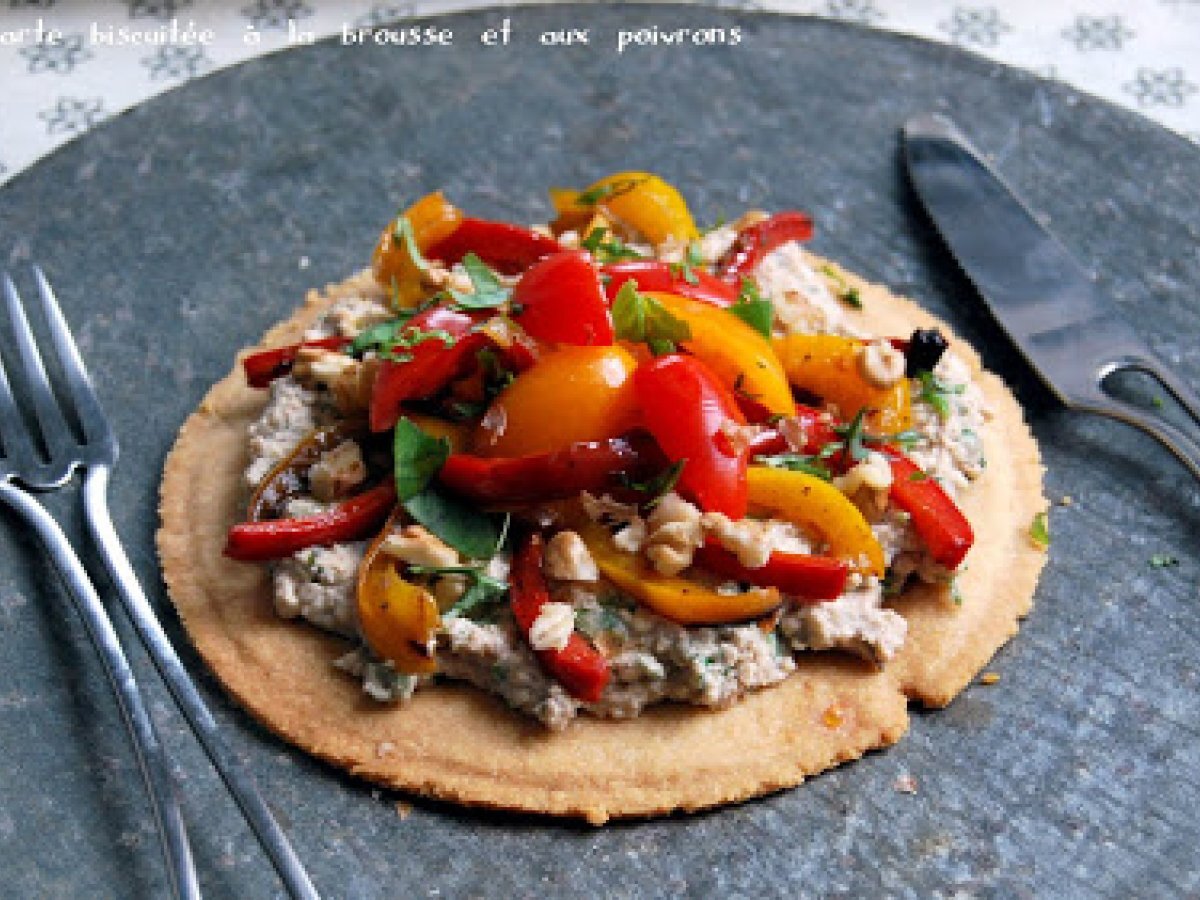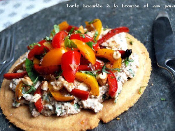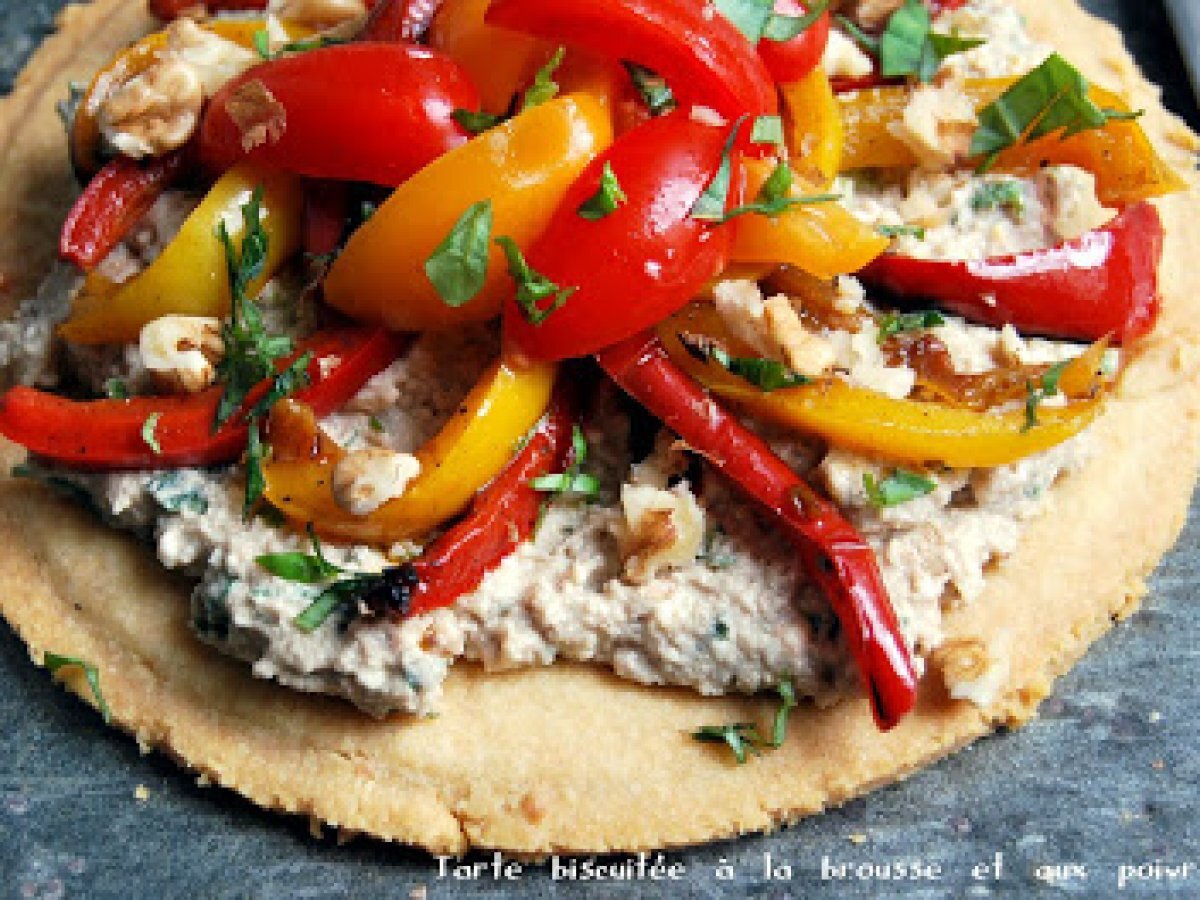 Tarte biscuitée à la brousse et aux poivrons. votez maintenant PrécédentSuivant Entréefacile30 min791 Kcal Envoyer cette recette à un ami Imprimer cette page Poser une question à l'auteur Publier votre photo de cette recette Ingrédients 4 80 g de parmesan râpé 120 g de poudre d'amandes 150 g de farine 100 g de beurre demi sel 1 jaune d'oeuf 1 beau poivron jaune 1 beau poivron rouge 2 cuillerées à soupe d'huile d'olive 300 g de brousse de brebis 30 g de câpres au vinaigre 30 g d'un mélange de feuilles de basilic, ciboulette et persil plat 1 cuillerée à soupe de vinaigre balsamique 1 dizaine de cerneaux de noix et quelques tomates olivettes jaunes et rouges sel et poivre