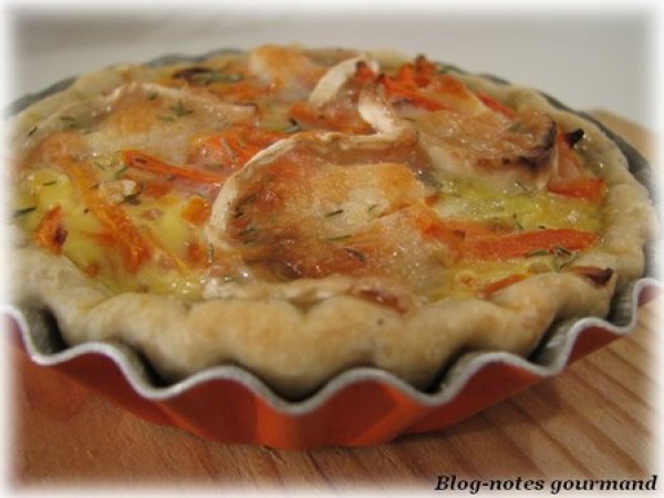 Tarte carotte chèvre parfumée au thym votez maintenant PrécédentSuivant Entréefacile1 h 20 m Envoyer cette recette à un ami Imprimer cette page Poser une question à l'auteur Publier votre photo de cette recette Une tarte salée, ça vous dit? Ingrédients 5 Pour la pâte: 100 g de farine T80 75 g de flocons d'avoine 4 càs d'huile d'olive un peu moins d'1/2 verre d'eau 1 pincée de sel Pour la garniture 1 petite carotte râpée 2 échalotes 1 oeuf 10 cl de crème liquide sel et poivre 2 càs de raisins secs fromage de chèvre en buchette thym