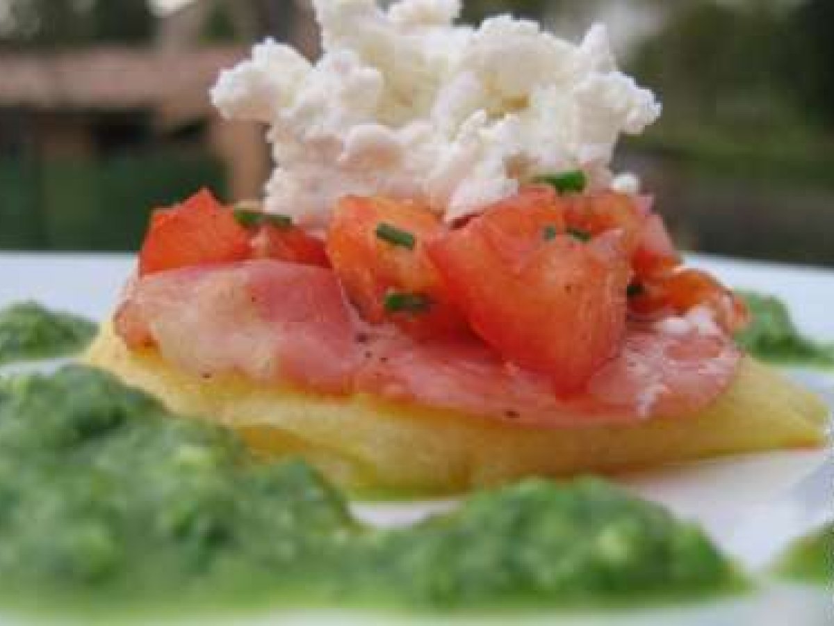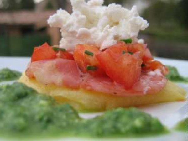 Tartine de polenta au pesto de fanes de radis Entréemoyen20 min Envoyer cette recette à un ami Imprimer cette page Poser une question à l'auteur Publier votre photo de cette recette Ingrédients 4 Ingrédients pour 4 personnes: 4 tranches de bacon 3 tomates 1 petit billy (chèvre frais) ou autre chèvre frais 1 cs de ciboulette fraîche 1 cs jus de citron 1 oignon nouveau 1 cs d'huile d'olive Coupez les tomates en petits dés, les mettre dans un bol avec le citron, l'oignon nouveau émmincé, l'huile d'olive et la ciboueltte ciselée, salez, poivrez. Réservez au frais. Mon pesto aux fanes de radis: 40 g de fanes de radis lavées et séchées 40 g de pignons de pin grillés à la poêle (à sec) 6 cuillères à soupe dhuile dolive 2 gousses dail dégermées 40 g de parmesan frais 70 g de chèvre frais le jus d1 citron non traité 1/2 cuillère à café de sel fin 1 cuillère à café de poivre du moulin Mettez tous les ingrédients dans le bol dun petit robot, mixez, cest prêt ! Tartines de polenta: 250 g de polenta (semoule de maïs) 1 litre d'eau sel Poivre du moulin 2 cuillères à soupe d'huile d'olive