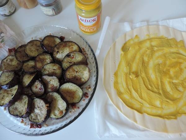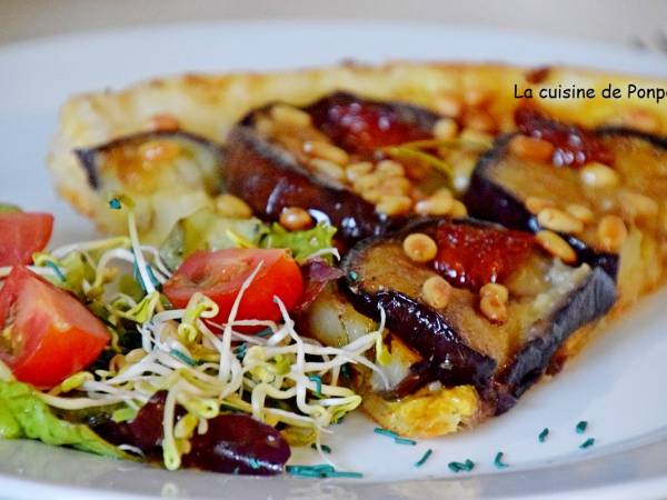 Tatin d'aubergines, tomates séchées, pignons et moutarde douce, végétarien