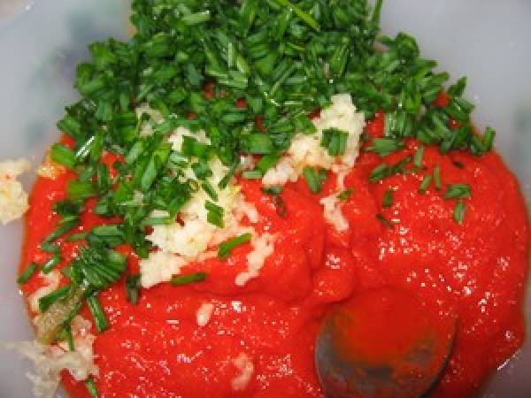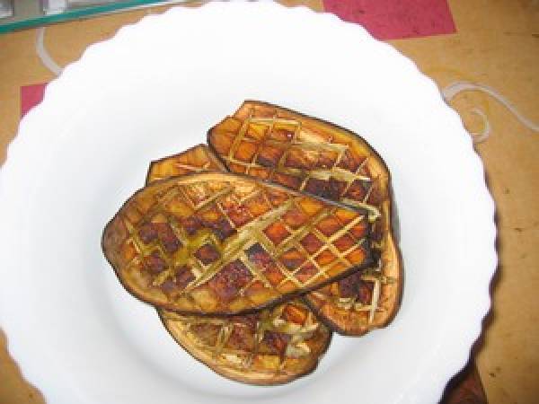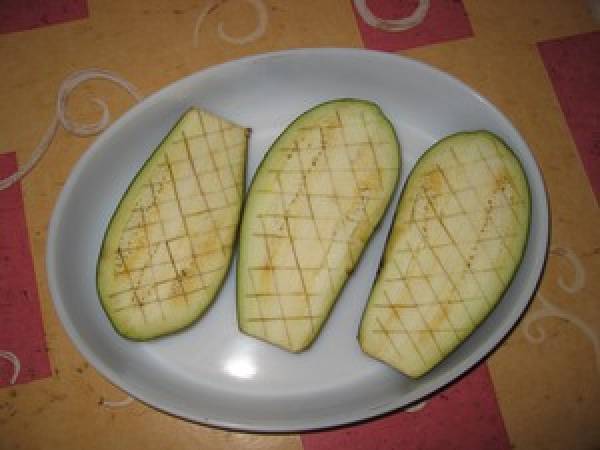 C'est une entrée très délicate et très fraîche. La couleur fait bizarre mais c'est la couleur de l'aubergine. Et quand on y incorpore une petite purée de poivrons rouges, alors là c'est un délice.