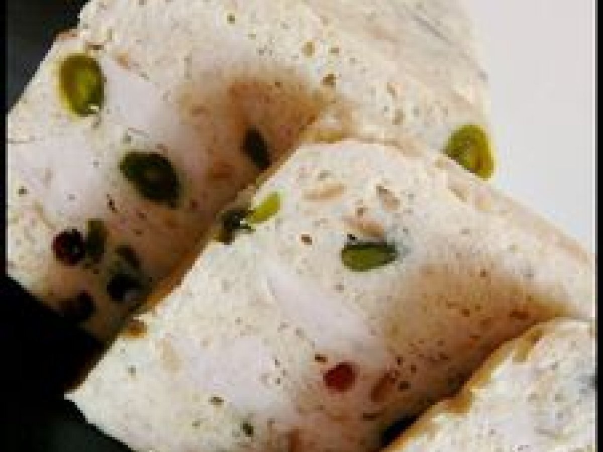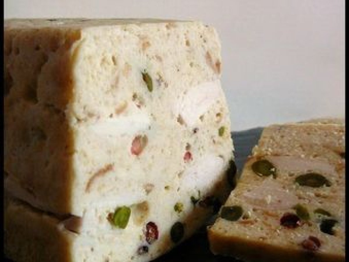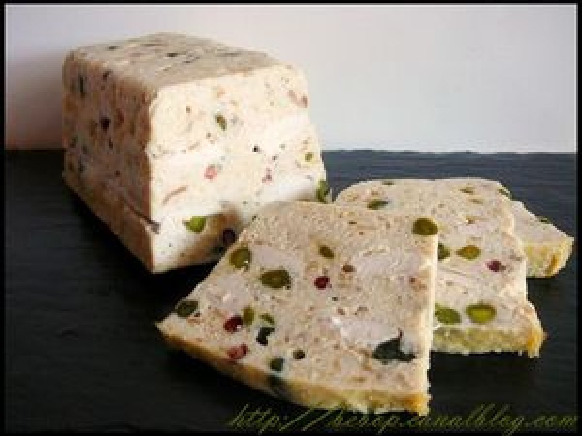 Terrine de poulet aux pistaches et baies roses votez maintenant PrécédentSuivant Entréefacile1 h 10 m244 Kcal Envoyer cette recette à un ami Imprimer cette page Poser une question à l'auteur Publier votre photo de cette recette Ingrédients 4 400 g de filets de poulet 1 tranche de pain (25-30 g) 2 cuillères à soupe de cognac 0,5 dl de crème 1 oeuf 30 g de pistaches 1 cuillère à soupe de baies roses 1 cuillère à café de sel 1 cuillère à café de poivre Coût estimé: 8.38Euros€ (2.1€/part)