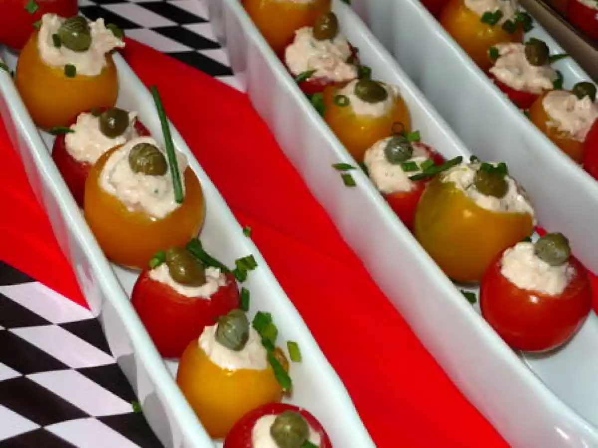 Tomates cerises farcies à la crème de saumon votez maintenant Entréemoyen25 min Envoyer cette recette à un ami Imprimer cette page Poser une question à l'auteur Publier votre photo de cette recette Ingrédients 10 30 tomates cerises 125 g de saumon fumé 60 g de Kiri 3 cuillères à soupe de crème fraîche 1 cuillère à café de jus de citron aneth, ciboulette sel, poivre 30 câpres