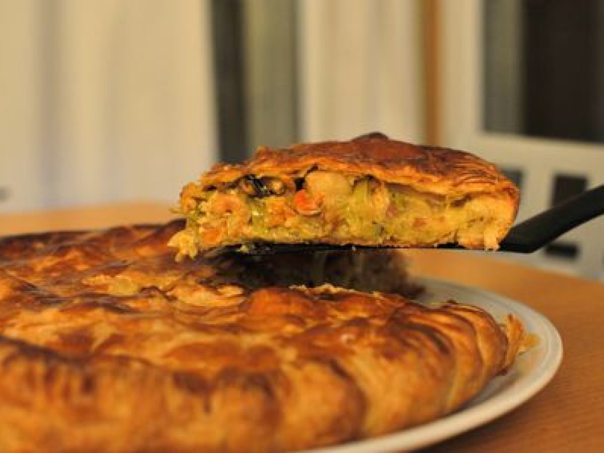 Tourte aux fruits de mer et saumon PrécédentSuivant Entréefacile50 min Envoyer cette recette à un ami Imprimer cette page Poser une question à l'auteur Publier votre photo de cette recette Ingrédients 4 2 pâtes feuilletées 1 filet de saumon de 500 g environ 200 g de moules 200 g de noix de coquilles Saint-Jacques 200 g de gambas 2 oignons 1 poireau 1 ou 2 carottes 2 cuillères d'huile d'olive 10 cl de vin blanc 2 cuillères à soupe de fond de poisson 20 cl de crème fraîche épaisse Sel et poivre 5 baies 1/2 cuillère à café de Curcuma 1/2 cuillère à café de Curry 2 cuillères à soupe de ciboulette