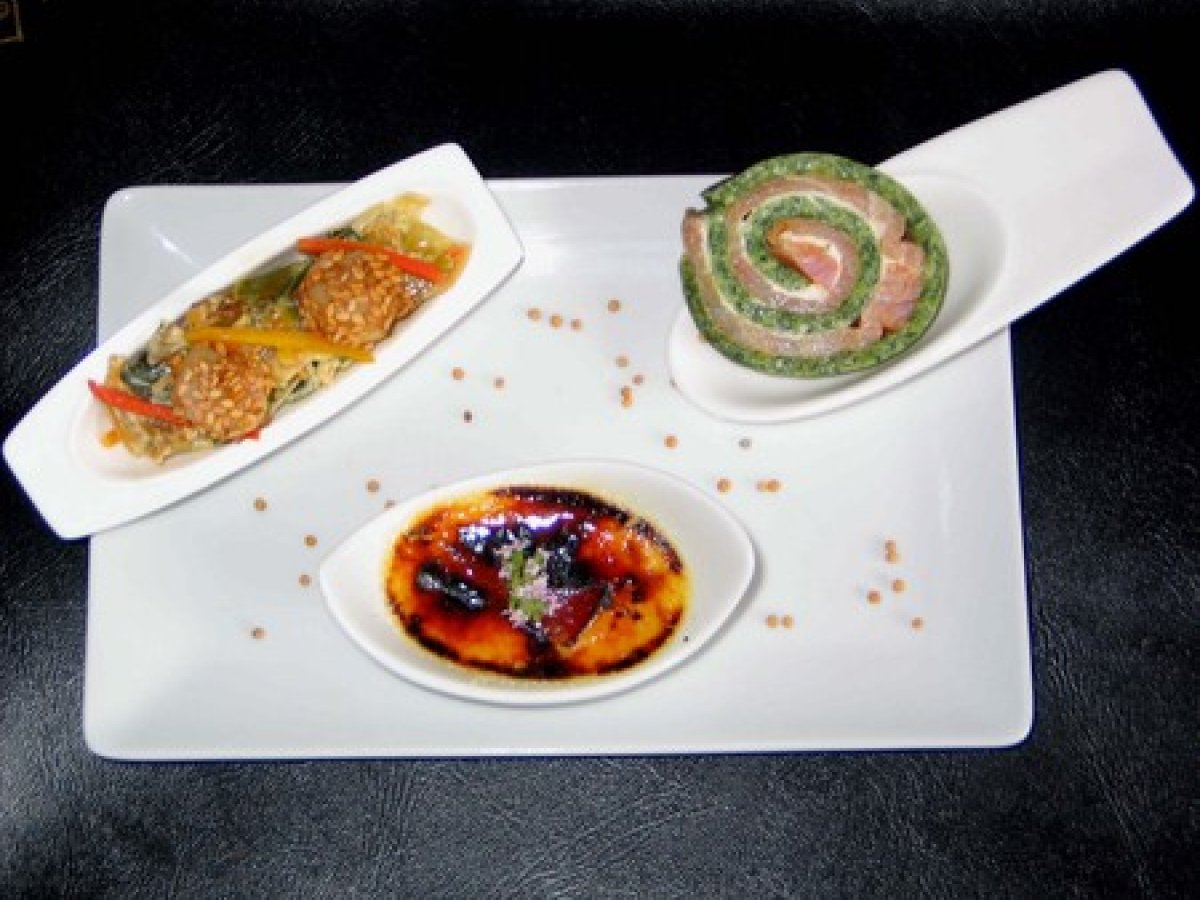 Un trio d'amuses-bouches à base de pétoncles, crevettes et saumon.