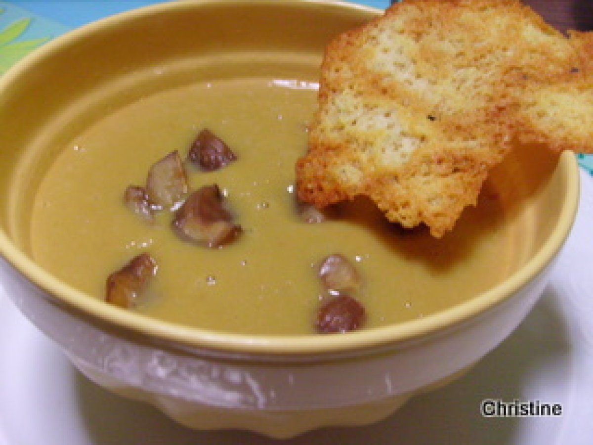 Velouté de butternut aux châtaignes et sa tuile de conté votez maintenant Entréefacile17 min Envoyer cette recette à un ami Imprimer cette page Poser une question à l'auteur Publier votre photo de cette recette Ingrédients 2 120 g de châtaignes 160 de butternut en dés 1/2 oignon 500 ml d'eau sel et poivre 1 cuillère à soupe de crème fraîche un peu de conté râpé 5 châtaignes concassées