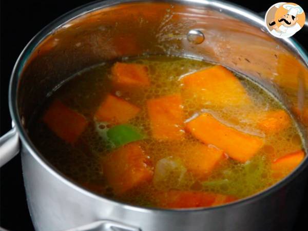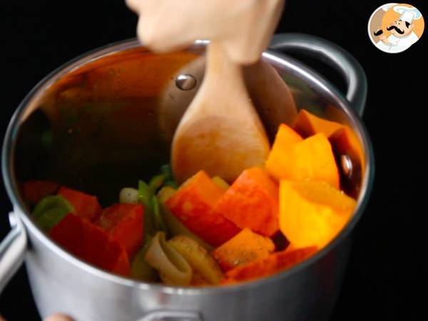Ajouter les morceaux de pommes de terre, de potimarron, du sel, du poivre et mélanger durant 3 minutes.
