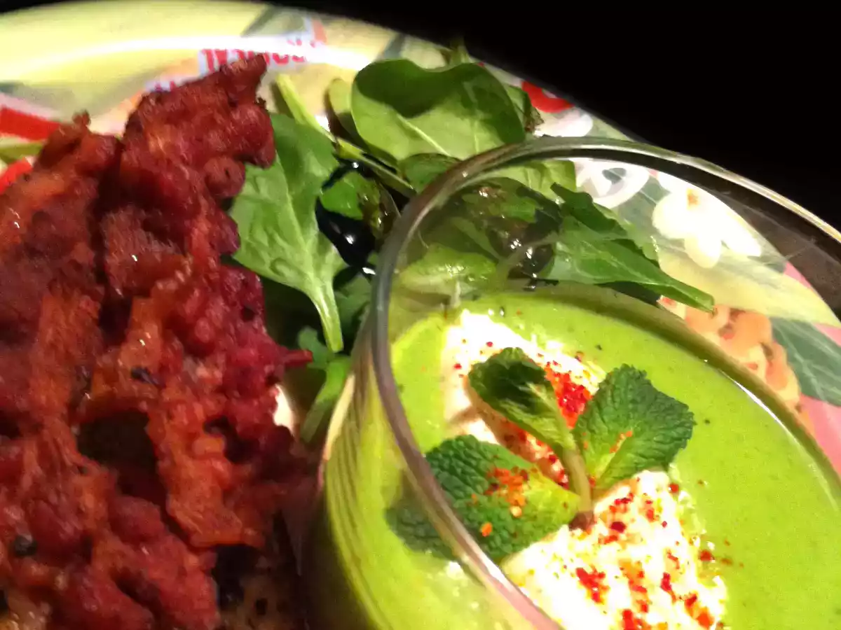 Velouté glacé de petits pois a la menthe et sa quenelle de chèvre frais & brushetta au pesto Entréefacile40 min284 Kcal Envoyer cette recette à un ami Imprimer cette page Poser une question à l'auteur Publier votre photo de cette recette Ingrédients 6 450 g de petits pois surgelés 15 feuilles de menthe fraiche 100 g de chèvre frais 3 mini tomates 2 cs d'huile d'olive 1 cs de crème fraiche épaisse 1 cc de piment d'Espelette sel & poivre 12 tranches de bacon 6 tranches de pain aux cereales pesto maison Coût estimé: 5.79Euros€ (0.96€/part)
