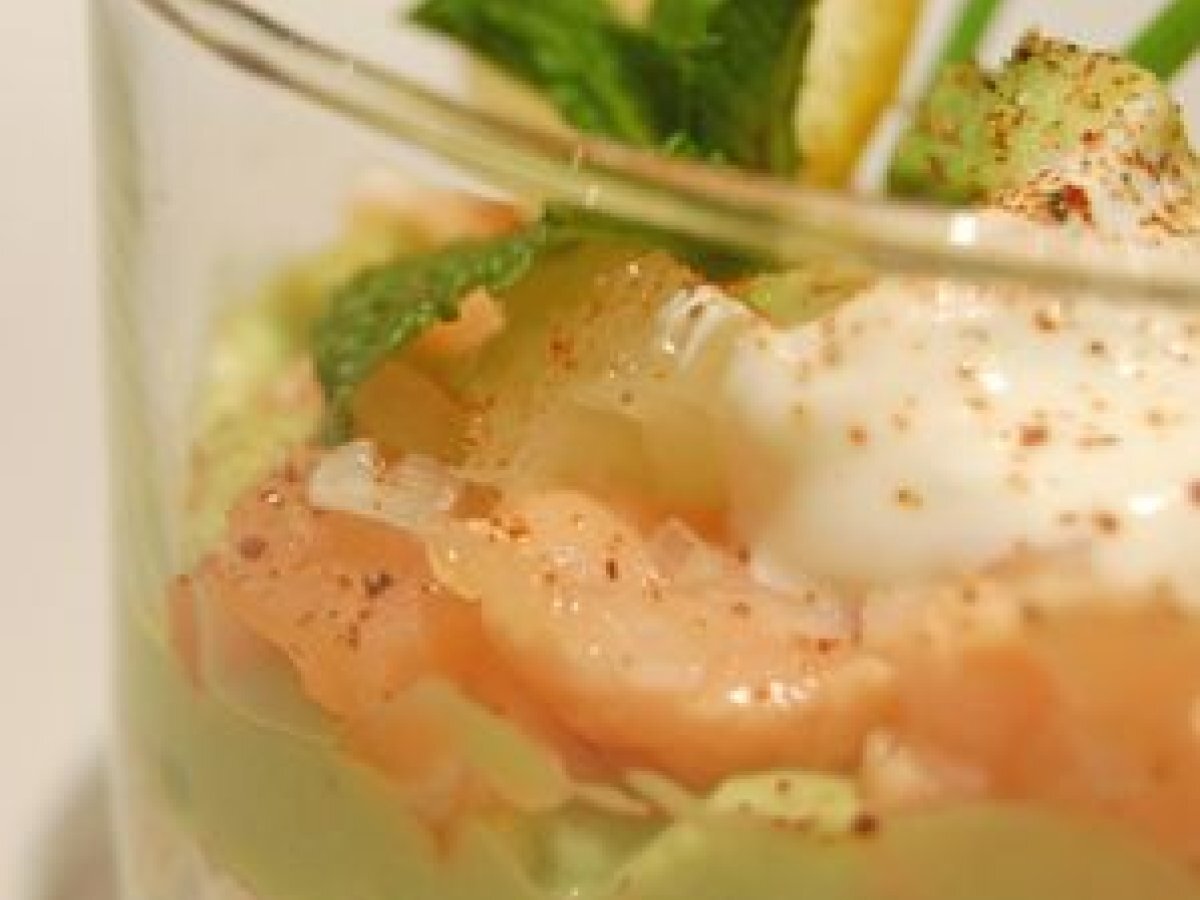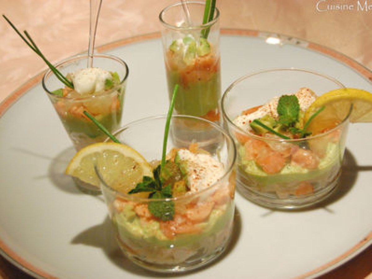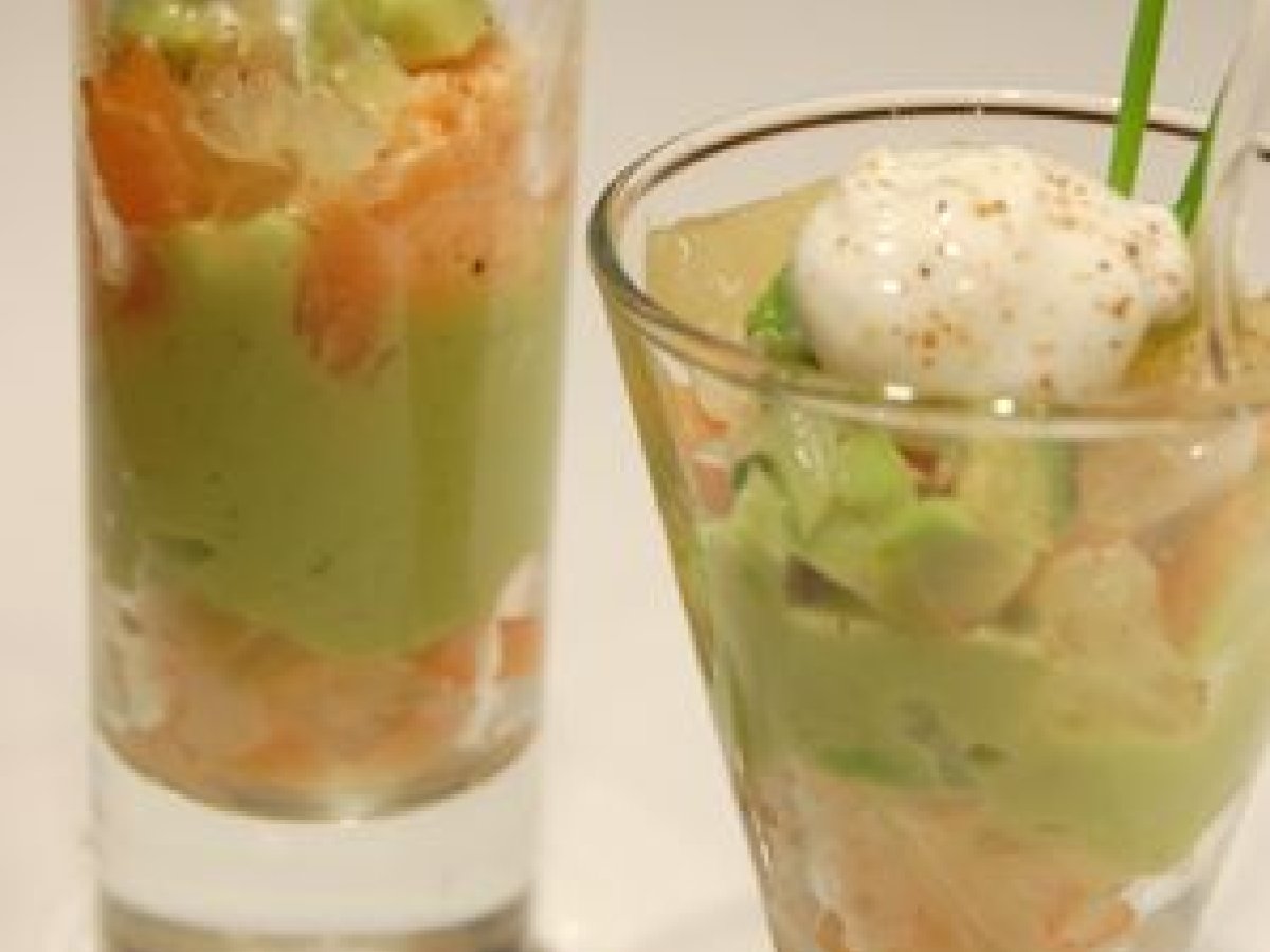 Verrine de la mer - saumon, crevette, avocat et pamplemousse