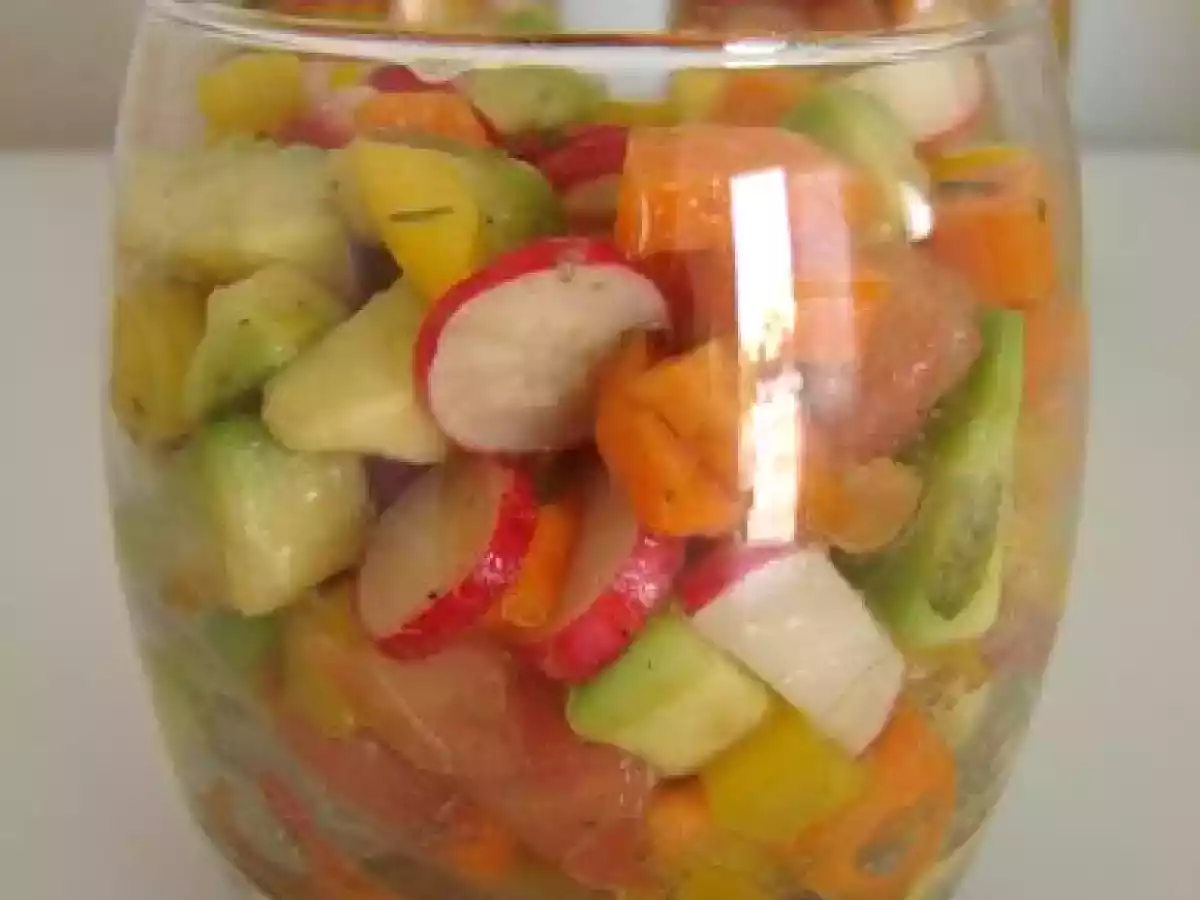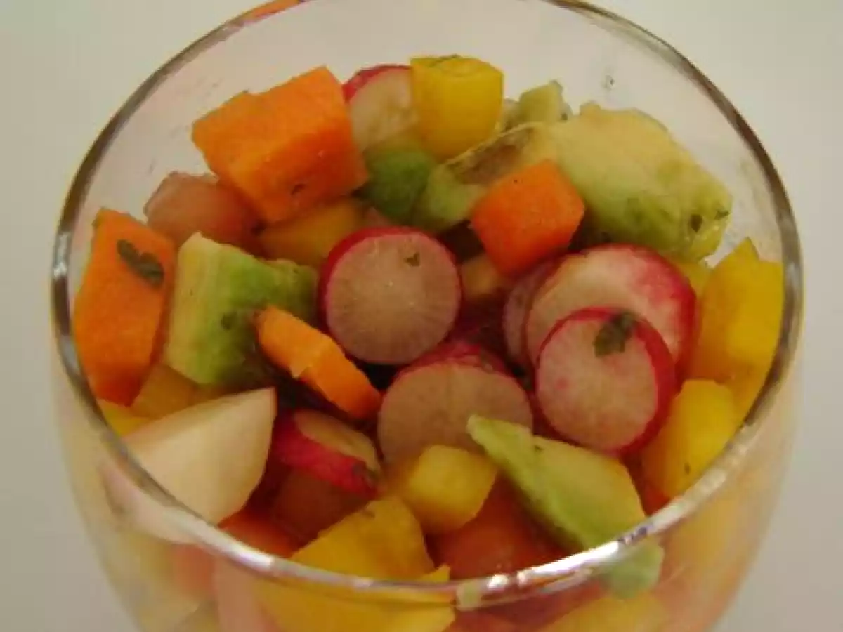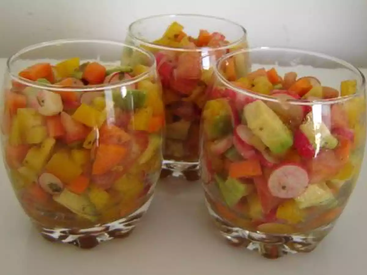 Verrine de légumes croquants PrécédentSuivant Entréefacile15 min104 Kcal Envoyer cette recette à un ami Imprimer cette page Poser une question à l'auteur Publier votre photo de cette recette Voici une recette qui vous rafraîchira les soirs d'été. Ingrédients 4 2 tomates 1 poivron jaune 1 carotte 1 avocat 10 radis roses jus de citron vinaigre balsamique huile d'olive persil sel et poivre Coût estimé: 2.31Euros€ (0.58€/part)