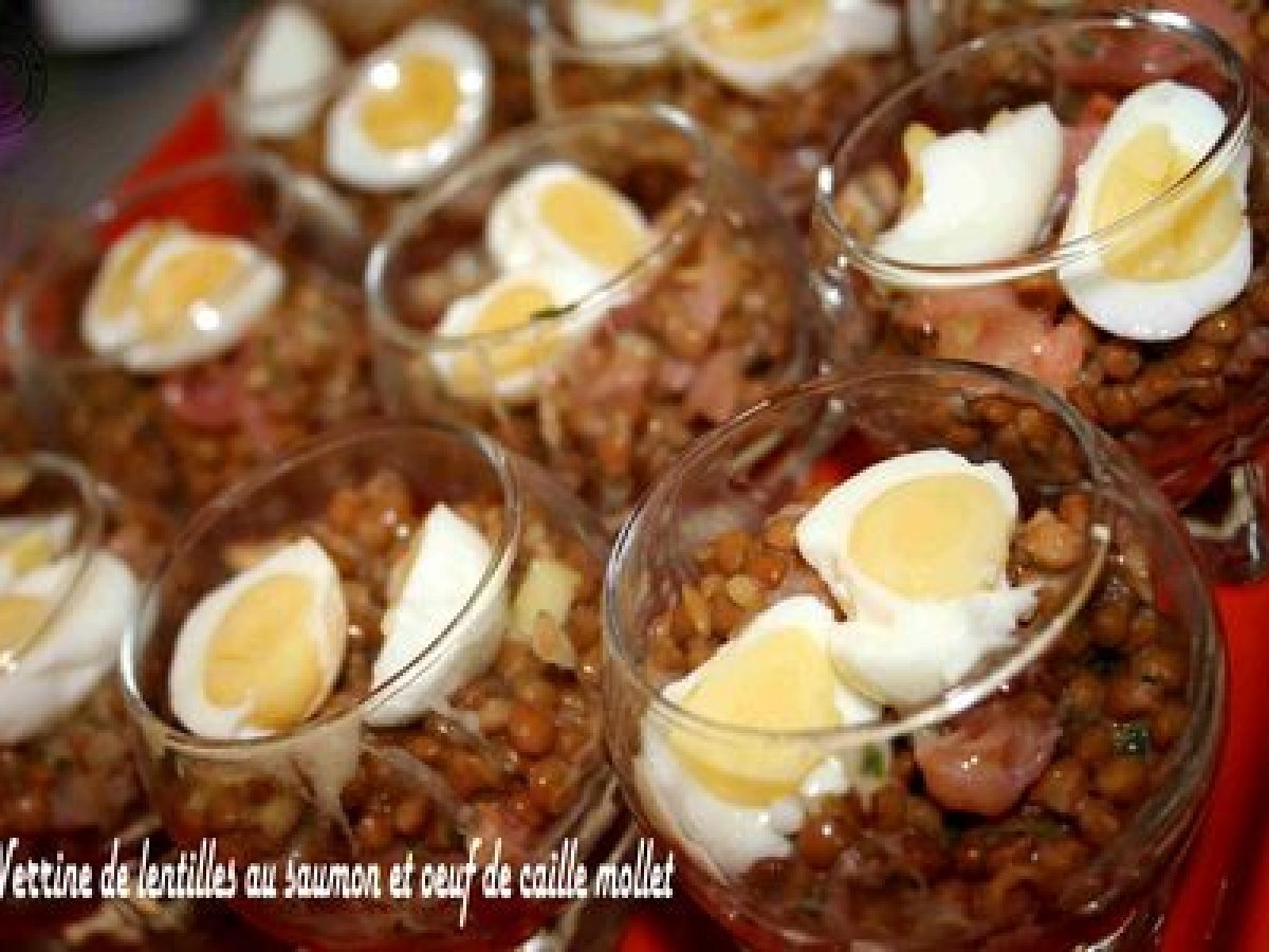 Verrine de lentilles au saumon et oeuf de caille mollet Entréefacile22 min95 Kcal Envoyer cette recette à un ami Imprimer cette page Poser une question à l'auteur Publier votre photo de cette recette Ingrédients 6 100 g de saumon fumé 6 oeufs de caille 180 g de lentilles une échalote du persil vinaigrette
