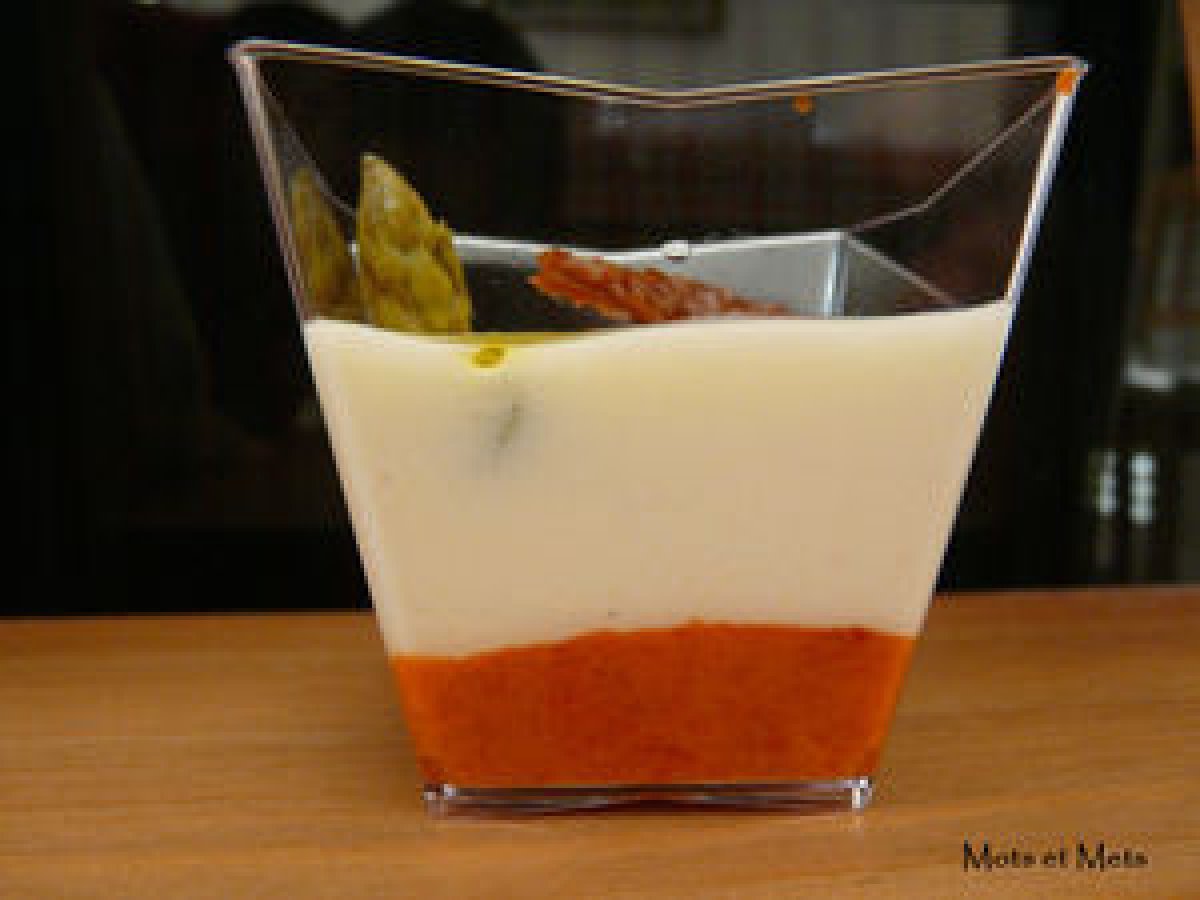 Verrine de panna cotta au brebis sur mousse de poivron, son asperge et sa tomate confite