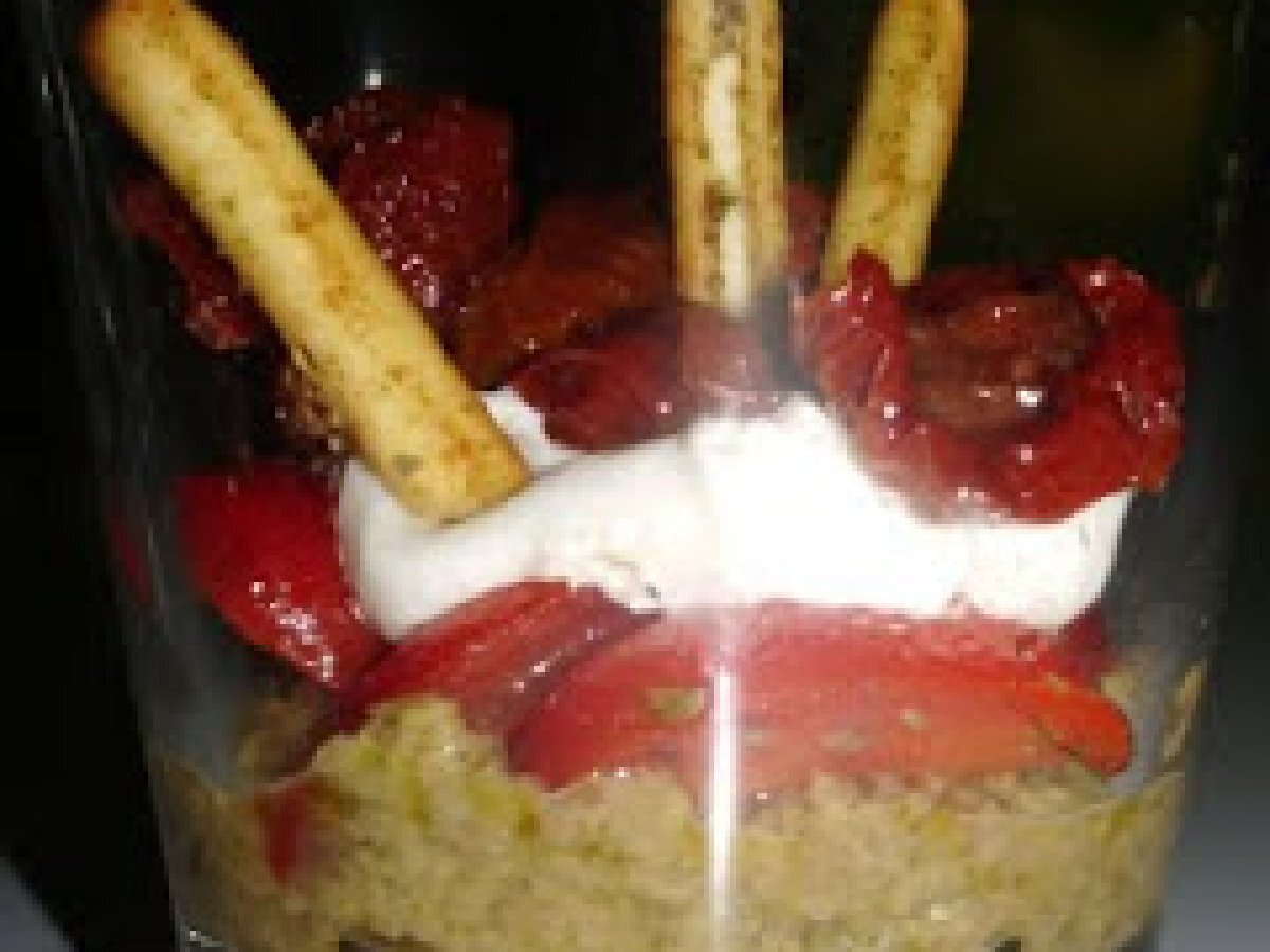 Verrines aux couleurs de l'italie Entréefacile10 min150 Kcal Envoyer cette recette à un ami Imprimer cette page Poser une question à l'auteur Publier votre photo de cette recette Ingrédients 4 1 petit pot de tapenade d'olives vertes Quelques tomates cerises 4 cuillères à café de St Moret 6 tomates sechées Huile d'olive Vinaigre balsamique Sel poivre Herbes de Provence