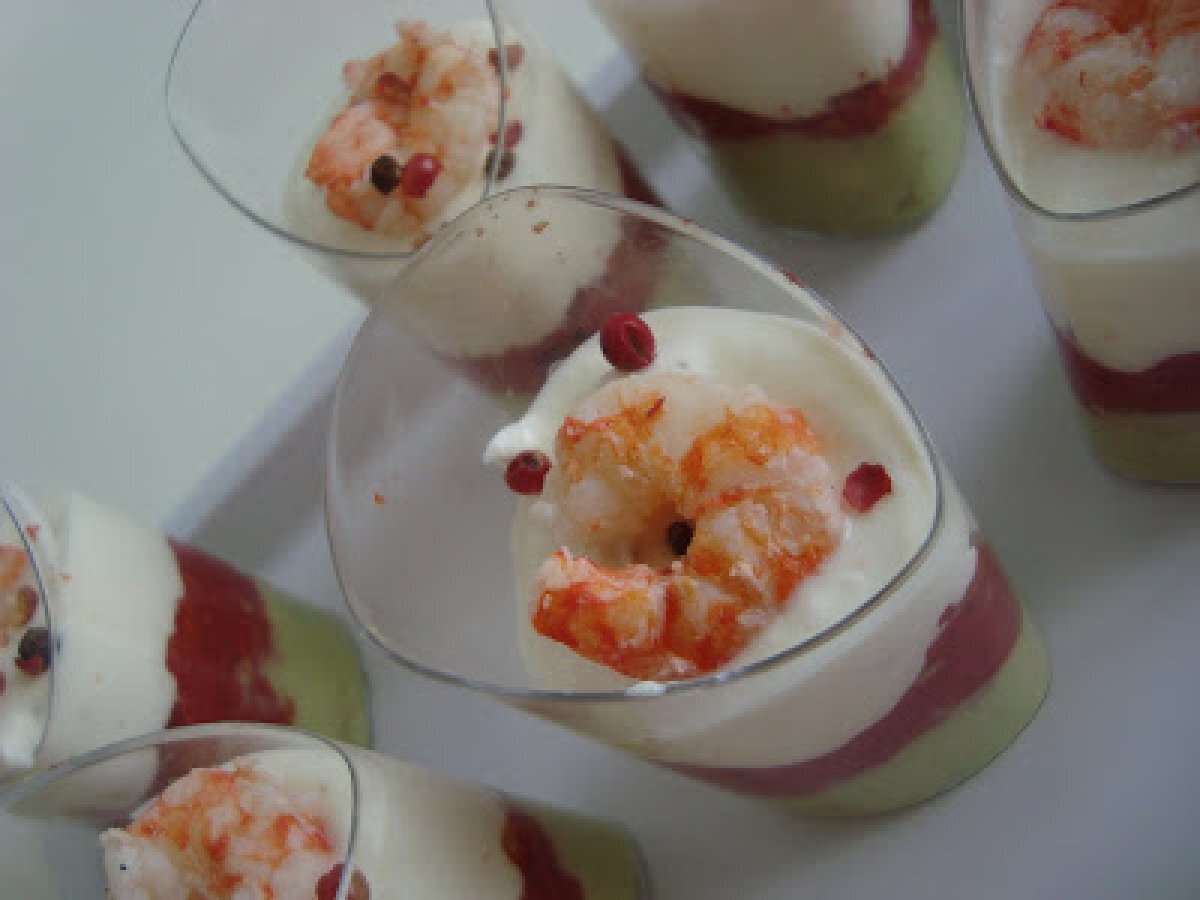 Verrines avocat-tomates-crème fouettée PrécédentSuivant Entréefacile15 min Envoyer cette recette à un ami Imprimer cette page Poser une question à l'auteur Publier votre photo de cette recette Ingrédients 5 2 avocats bien mûrs 6 belles tomates 1 boite de crème fraîche une boite de fraidoux des crevettes Le jus d'un citron une gousse d'ail de la coriandre moulue basilic quelques baies roses, piment d'espellete