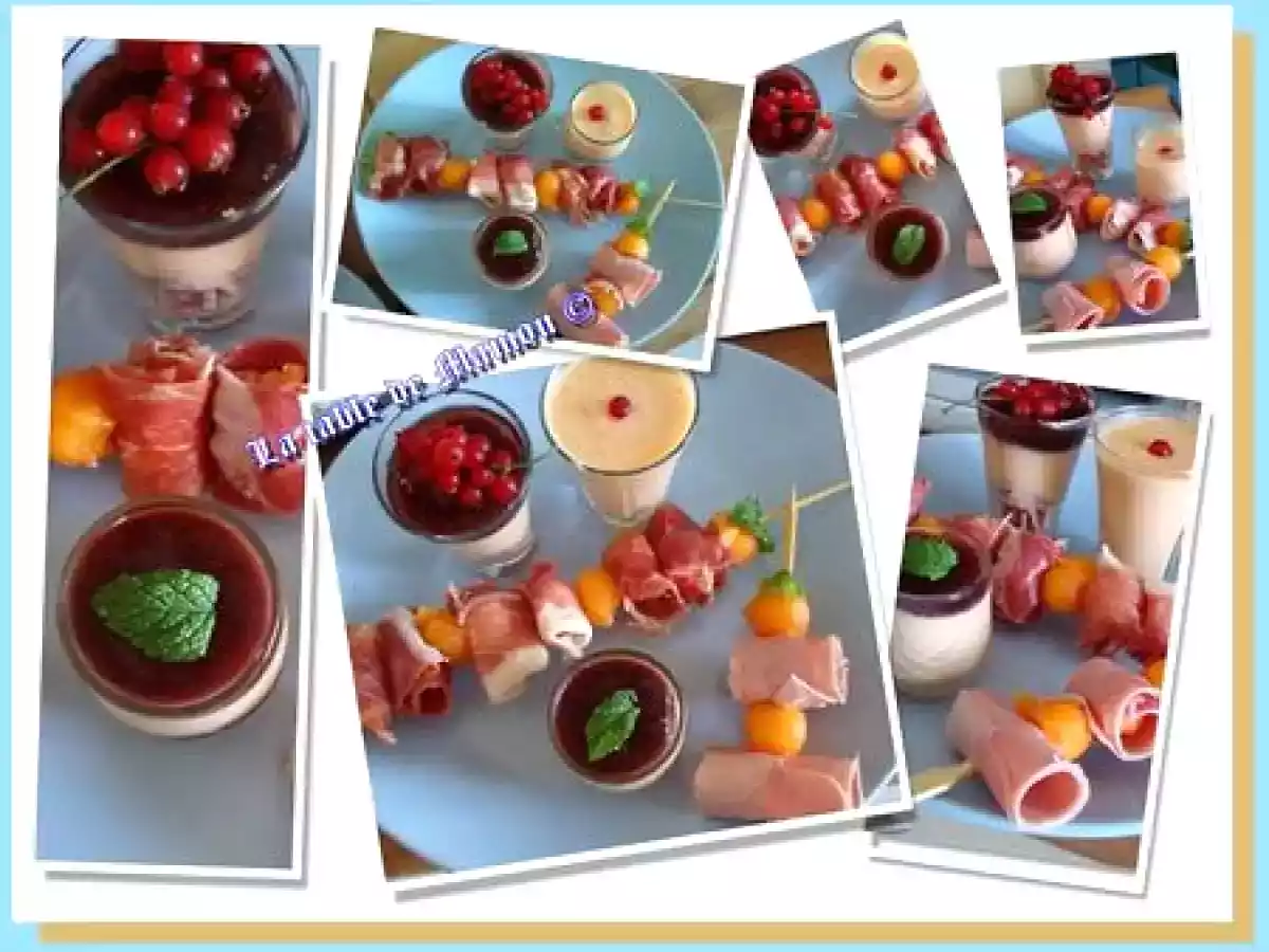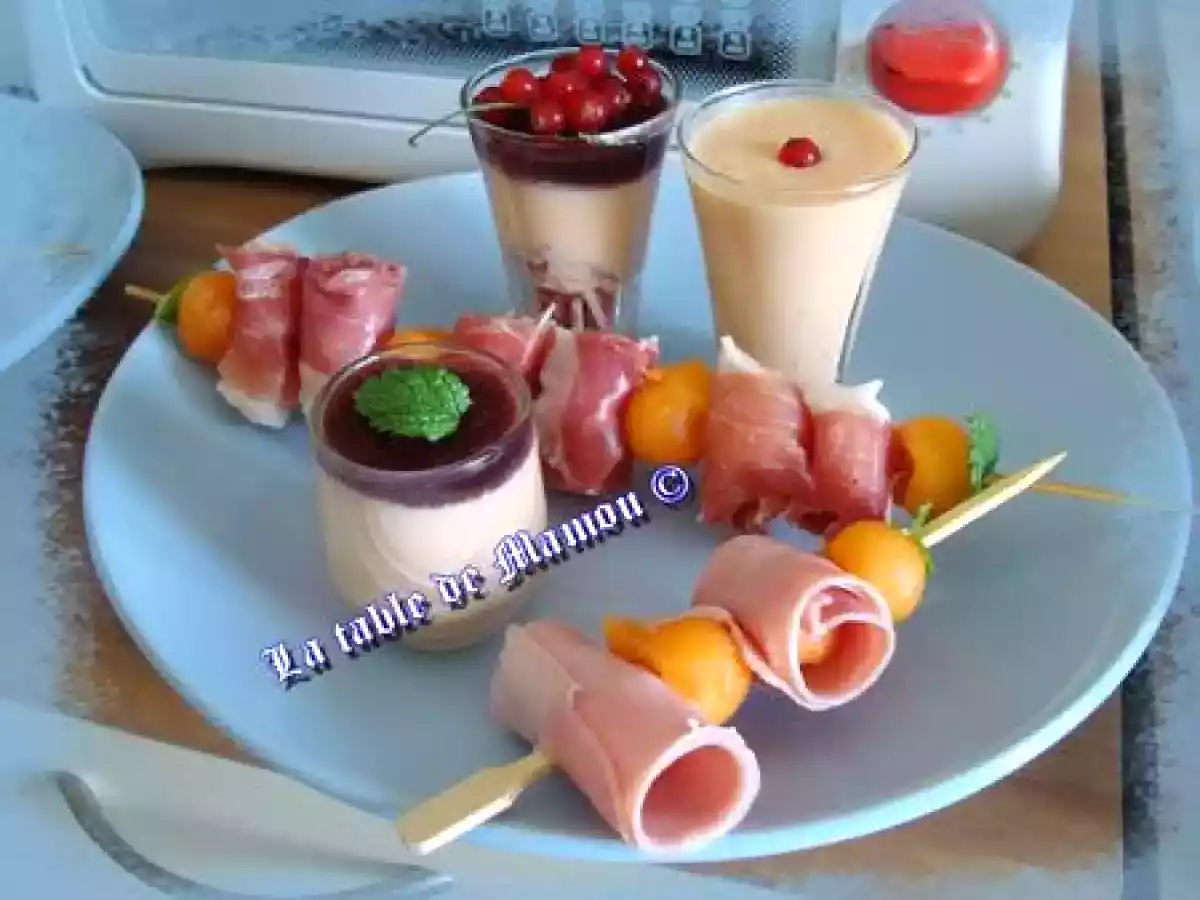Verrines crème de melon, gelée de porto et ses deux brochettes PrécédentSuivant Entréefacile20 min Envoyer cette recette à un ami Imprimer cette page Poser une question à l'auteur Publier votre photo de cette recette Ingrédients 8 3 gros melons 250 g de ricotta 2 feuilles de gélatine Piment d'Espelette 10 cl d'eau 2 g d'agar-agar 10 cl de Porto 50 g de jambon râpé fumé 6 tranches de jambon de Parme 6 tranches de jambon cru Italien 4 tranches de jambon blanc tranché fin à l'italienne 10 feuilles de menthe 6 feuilles de basilic 4 grappes de groseilles 4 brochettes longues et 4 courtes