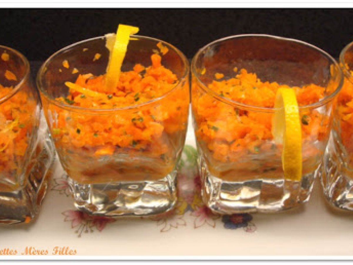 Verrines de carottes confites au miel et au cumin Entréefacile45 min Envoyer cette recette à un ami Imprimer cette page Poser une question à l'auteur Publier votre photo de cette recette Ingrédients 4 500 grammes de carottes 1 à 2 gousses d'ail 1 cuillère à café de cumin 1 cuillère à café de graine de coriandre un peu de thym 1 cuillère à soupe de miel 1 citron 3 cuillères à soupe d'huile d'olive 1 cuillère à soupe de persil sel poivre