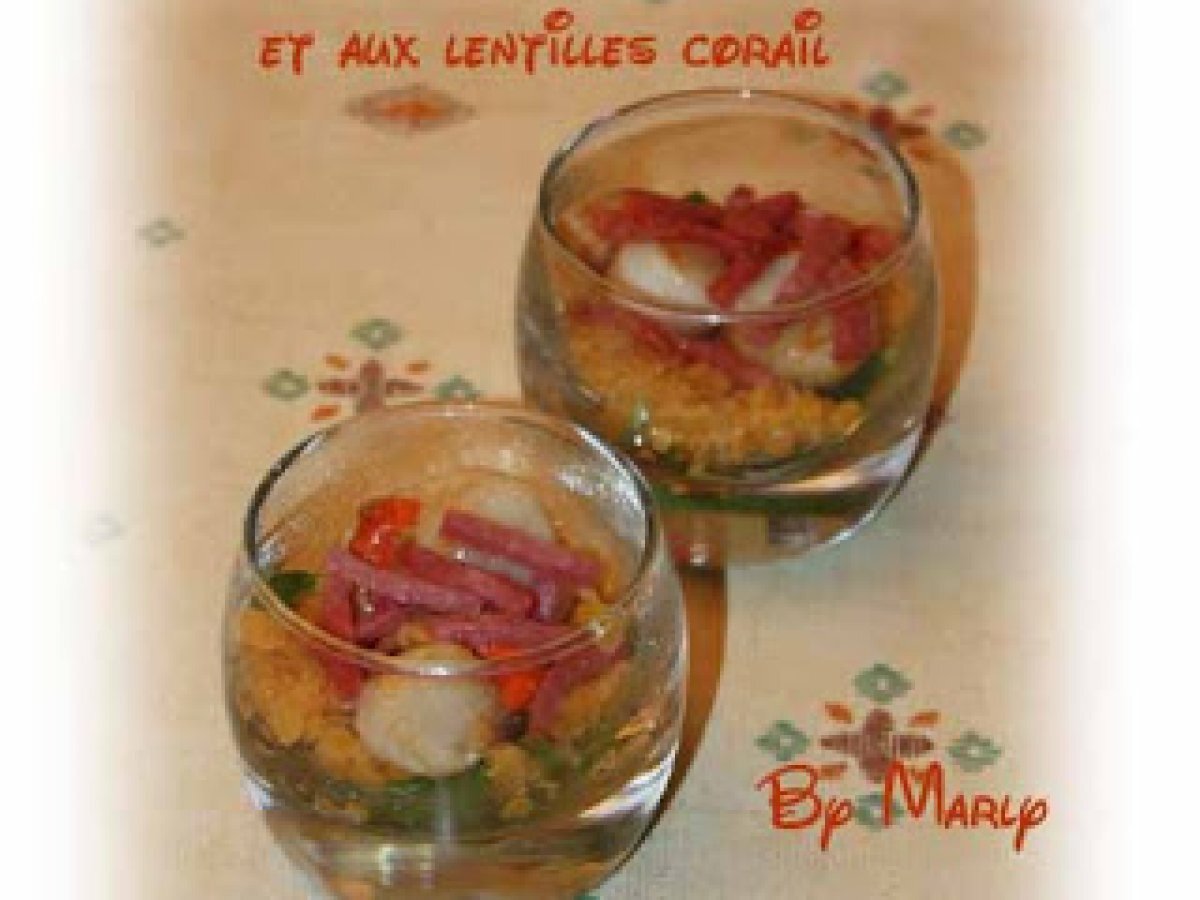 Verrines de st jacques aux lardons et lentilles corail Entréefacile41 min Envoyer cette recette à un ami Imprimer cette page Poser une question à l'auteur Publier votre photo de cette recette Ingrédients 2 Qqs feuilles de mache De la vinaigrette 1 tasse de lentilles corail 75 g lardons 1 petit paquet de coquilles St Jacques surgelées