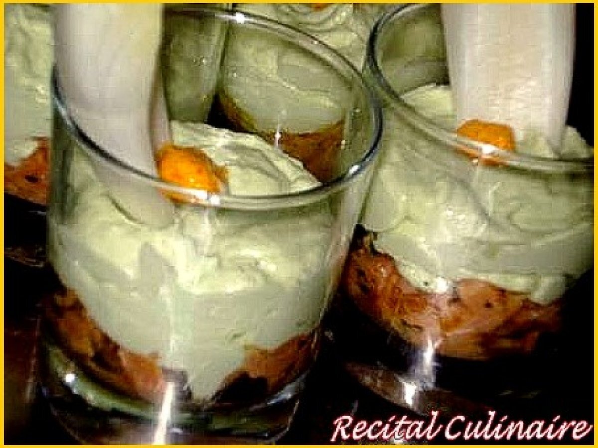 Verrines mousse d'avocat et tartare de saumon PrécédentSuivant Entréefacile20 min Envoyer cette recette à un ami Imprimer cette page Poser une question à l'auteur Publier votre photo de cette recette Ingrédients 4 2 avocats bien mûrs 20 cl de crème liquide entière 200 g de saumon fumé en tranches jus de citron jaune zestes de combava brins de ciboulette coriandre fraîche ou surgelée basilic frais ou surgelé persil frais ou surgelé sel de guérande sel fin poivre du moulin un peu de tarama de votre choix une petite endive