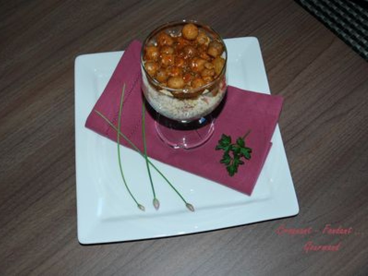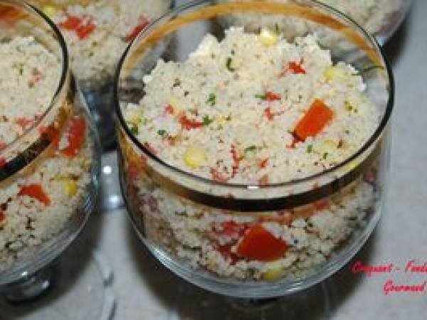 Verrines taboulé-champignons à la grecque votez maintenant Entréefacile40 min Envoyer cette recette à un ami Imprimer cette page Poser une question à l'auteur Publier votre photo de cette recette Ingrédients 6 Le taboulé : 300 g de semoule de couscous moyen 420 g d'eau + 1 cuillère à café de sel 3 tomates 100 g de maïs en boîte 2 cuillères à soupe de ciboulette ciselée 2 cuillères à soupe de coriandre hachée 2 cuillères à soupe de persil haché 5 cuillères à soupe d'huile d'olive 2 cuillères à soupe de jus de citron sel et poivre du moulin Les champignons : 450 g de tout petits champignons de Paris 8 tout petits oignons blancs 20 cl de vin blanc 5 cl d'huile d'olive le jus d'1 citron 1 cuillères à soupe de sucre en poudre 1 cuillères à soupe de concentré de tomate 2 cuillères à soupe d'herbes de Provence sel et poivre du moulin