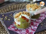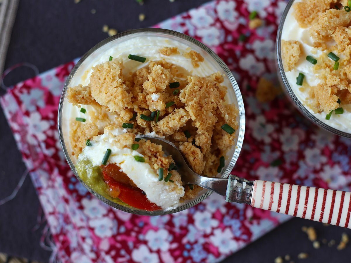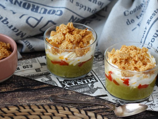 Verrines végétariennes: crème de petit pois, crumble de parmesan et crème au mascarpone