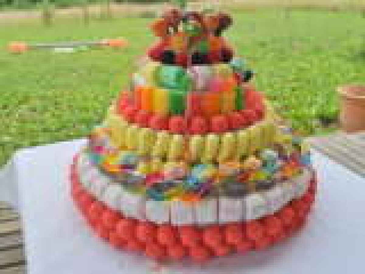 j'ai réaliser un gâteau de bonbons pour le bâpteme de mon Baptiste qui a eu lieu le 21 juin !!! il a eu un succès fou les enfants se sont jetés dessus enfin les adultes aussi LOL
