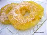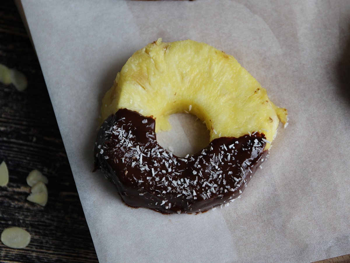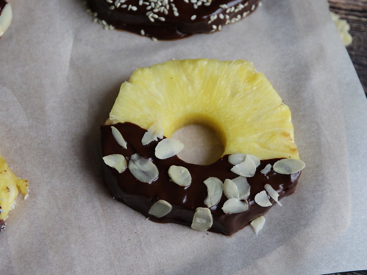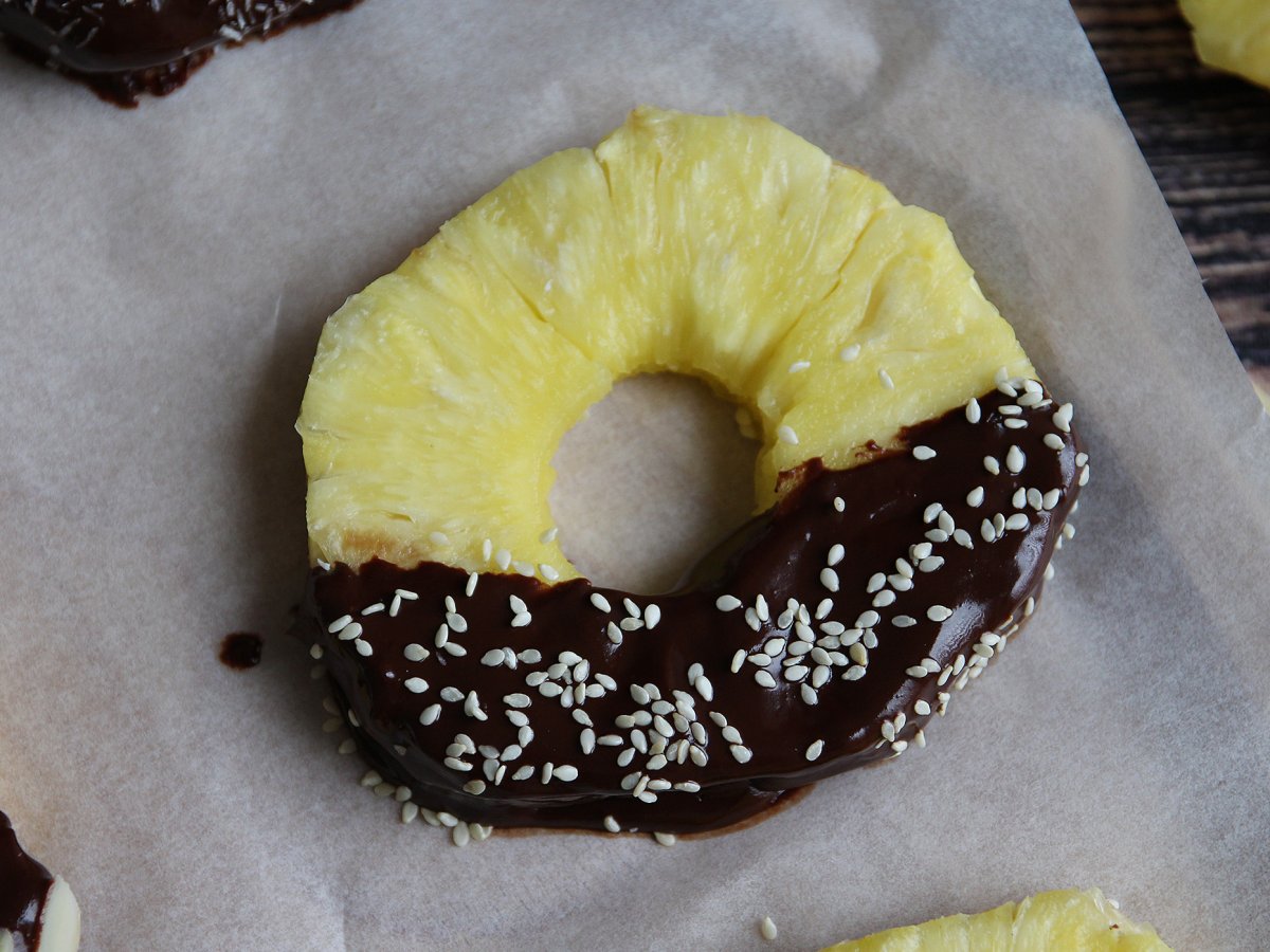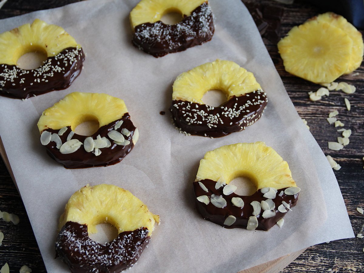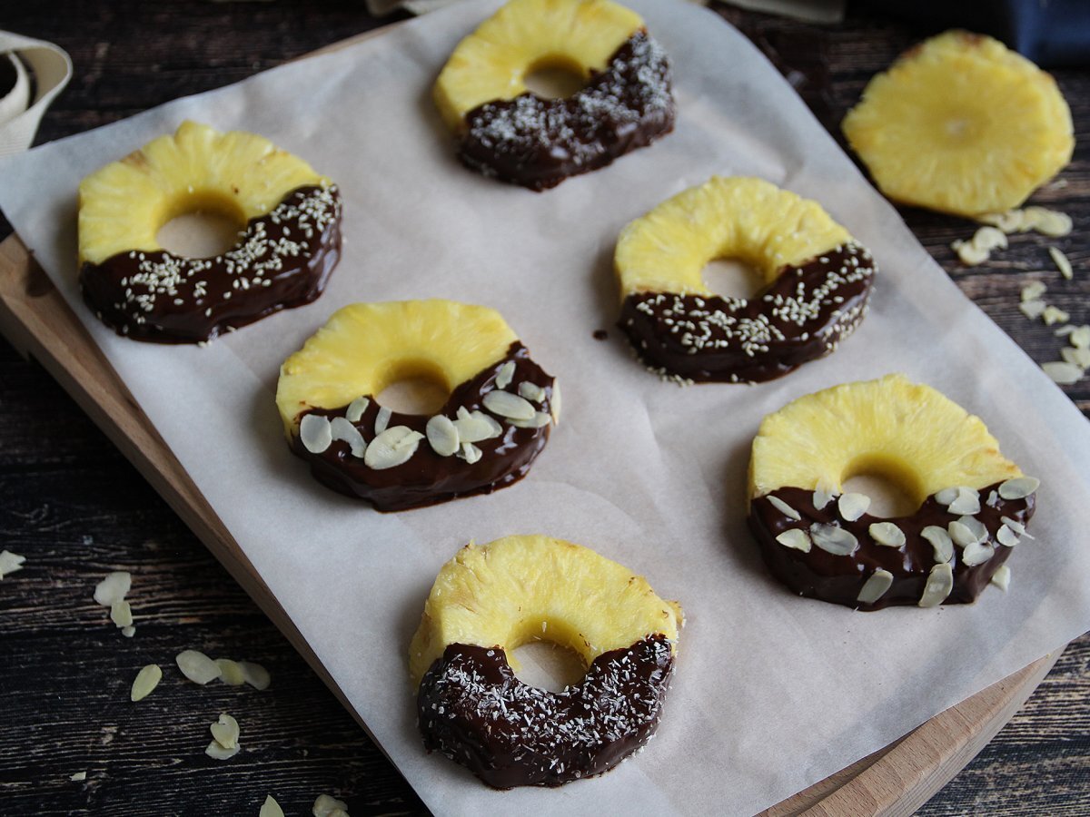 Pour le dessert, il n'y a pas plus simple que cette recette ! Des rondelles d'ananas trempées dans du chocolat fondu et parsemées de coco râpée, d'amandes effilées et de graines de sésame. Sans sucre ajouté, vous pourrez ainsi allier la gourmandise du chocolat à la fraîcheur du fruit.