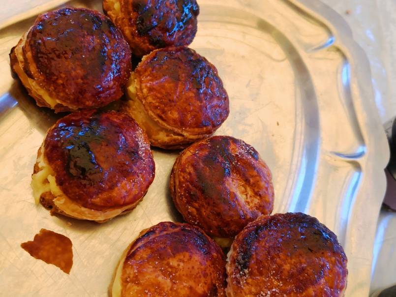 Prenez un beignet de pâte feuilletée, et faites un trou avec la pointe d'un couteau sur le côté. A l'aide d'une poche à douille, remplissez le beignet de crème pâtissière.